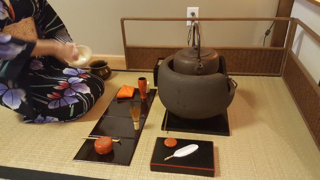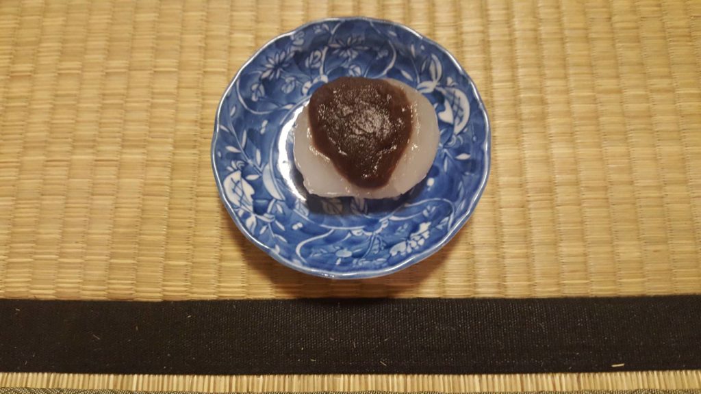 The second and third week of September we practiced Chabako-tsuki-demae.It is still hot over 30 degrees outside. Yet, the smell of cool autumn air is beginning to creep into the early mornings and nights. Chabako-tsuki-demse is one of the seasonal tea box series. Tsuki (moon) temae is often performed during the autumn since that is when the moon is most beautiful. Inside the tea boxes, you will find a round incense holder (moon) and white feather (cloud) next to the Furo.Tsuki-demae also is considered the most elegant and beautiful ritual among the Chabako series.This week, the picture on the scroll is grape and the sweet is Kuzu Mochi with sweet bean anko.