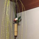 お客様全員で順番にお床(掛物、お花、正月飾り)を拝見し、その後、長板とその上に置かれたお道具を拝見、お釜に向きを変えてお釜を拝見し席入りします。お軸は『松柏千年青』(しょうはくせんねんのあお)漢詩の冒頭部分。移ろいやすい世の中で振り回されず、変わらずそこに生き続ける存在という意味です。お花は紅白の椿に結び柳、床の間正面には初釜定番のお飾り、裏白の上に組紐でできた海老と海の幸・山の幸。長板の上には『黄交ち(足偏に止)焼』(きこうちやき)の水指・杓立て・建水・蓋置。お釜は竹の地紋のある天明釜、炉縁は松喰い鳥(鶴)の蒔絵が施された塗縁。炉には種炭がおこって(燃えて)います。