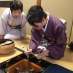 席入り後、宗純による初炭手前の後は懐石です。林先生手作りの白みそ仕立てのお雑煮、黒豆、数の子と仕出しのお膳にお酒が振る舞われました。その後、初釜恒例の花びら餅をいただいて中立ち(席を一端離れる)。