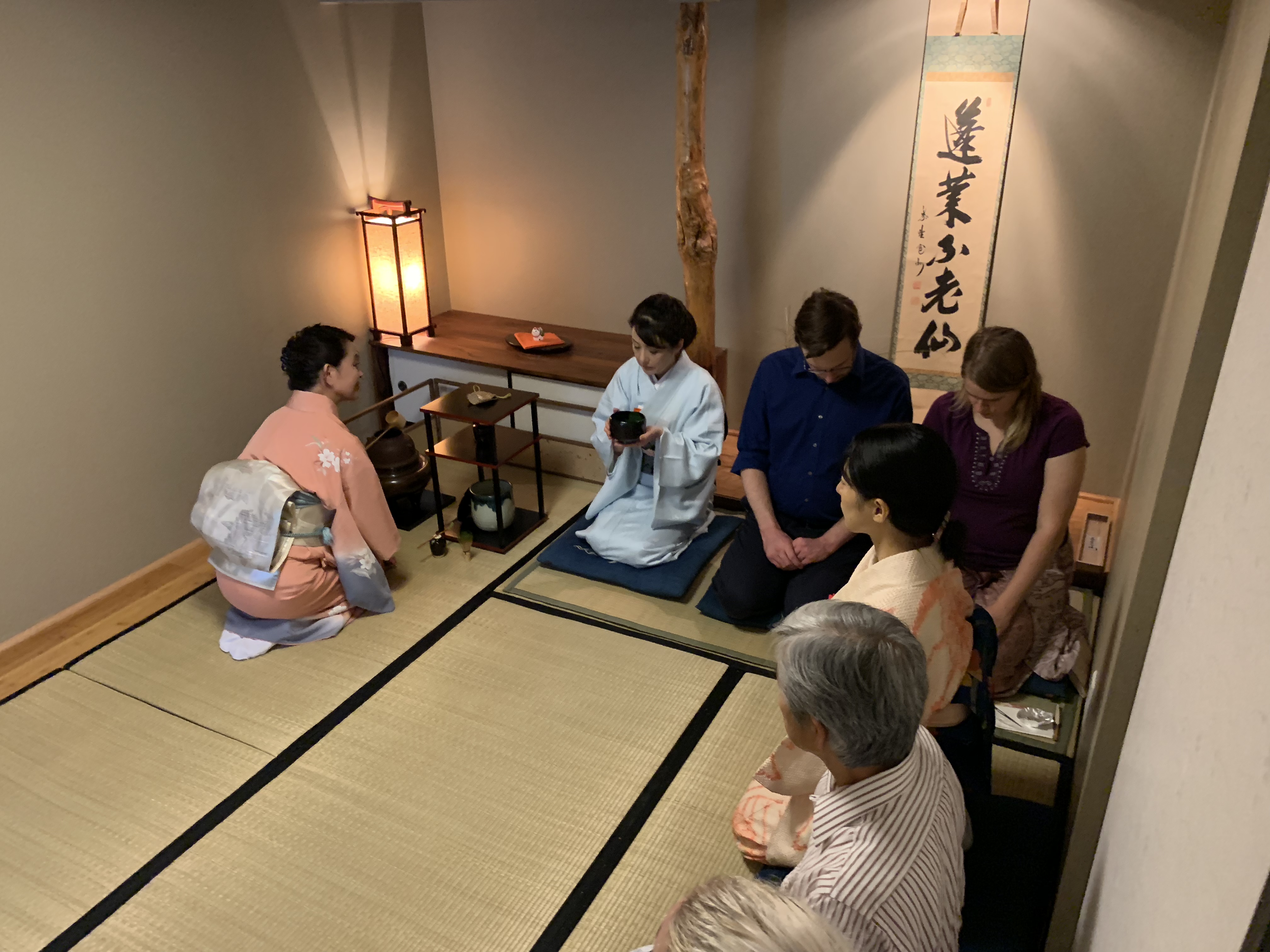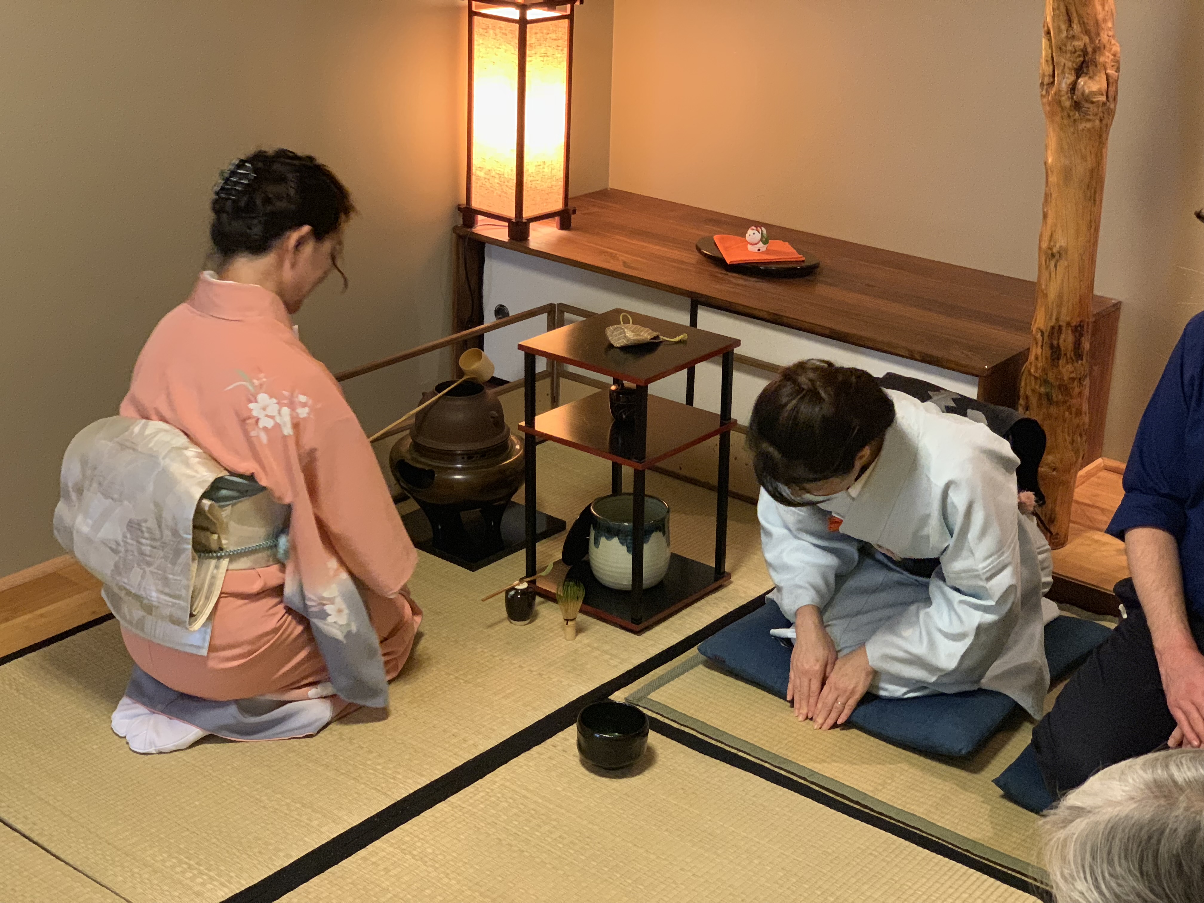 炭手前は省略し、2班に分かれて重ね茶碗のお点前でお濃茶をいただいた後、御薗棚を使って立礼式のお点前で薄茶をいただきました。