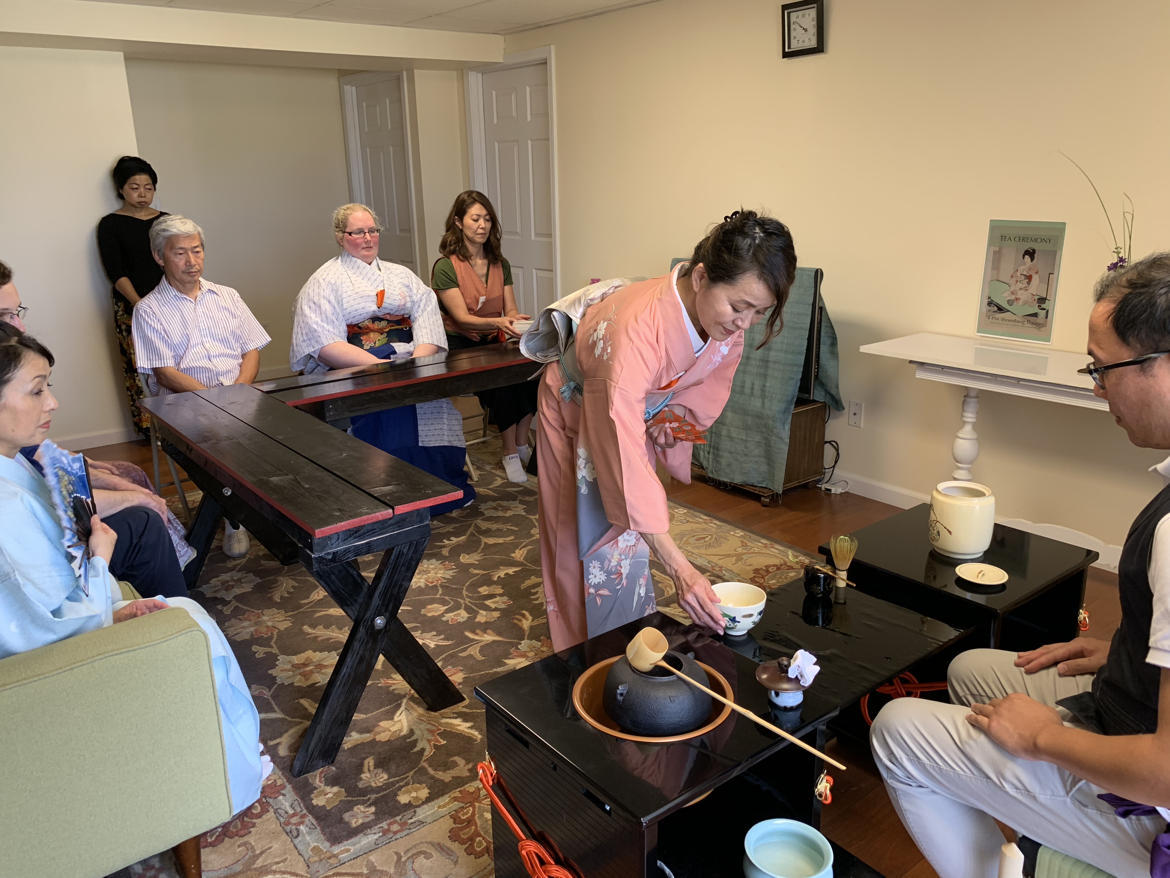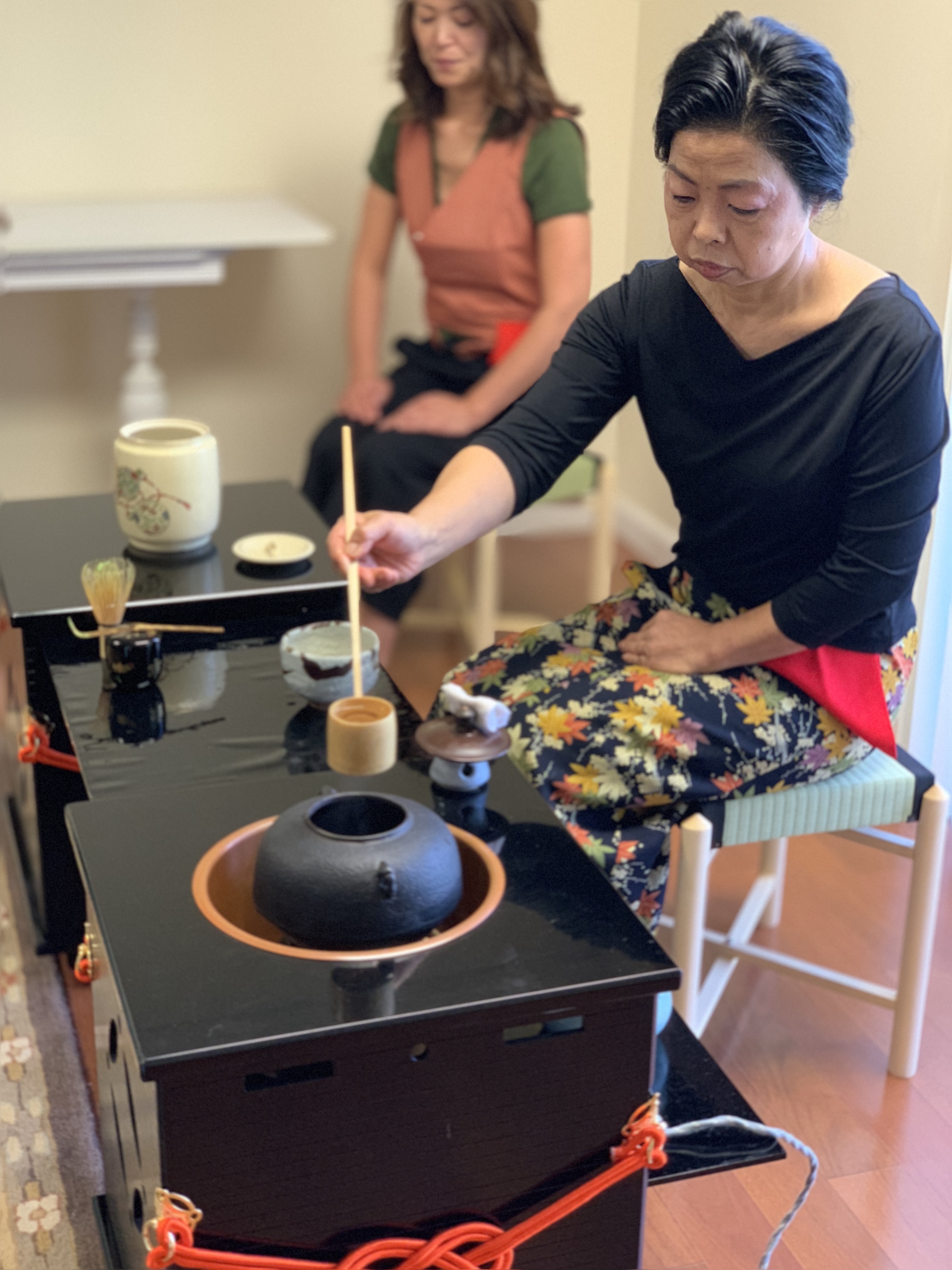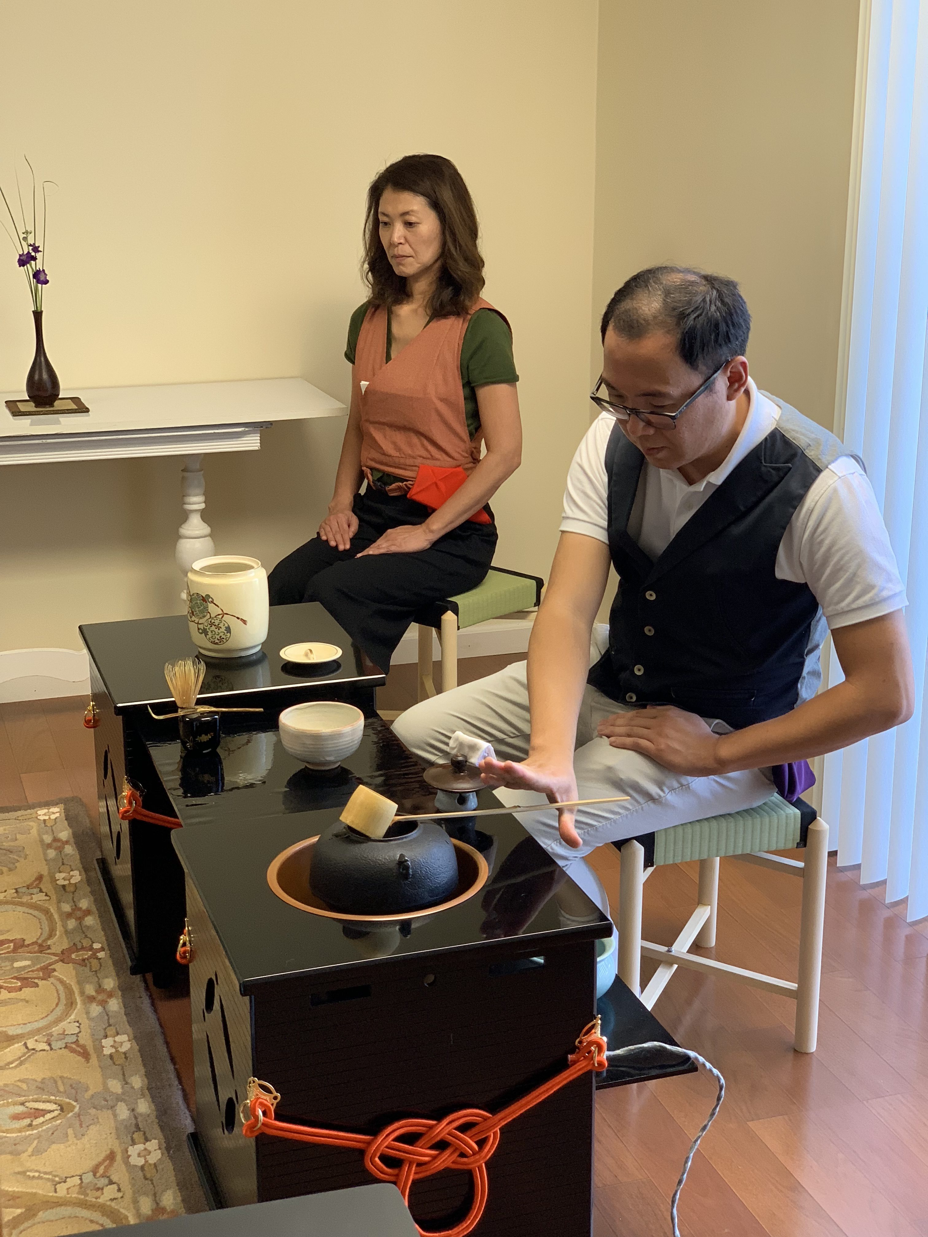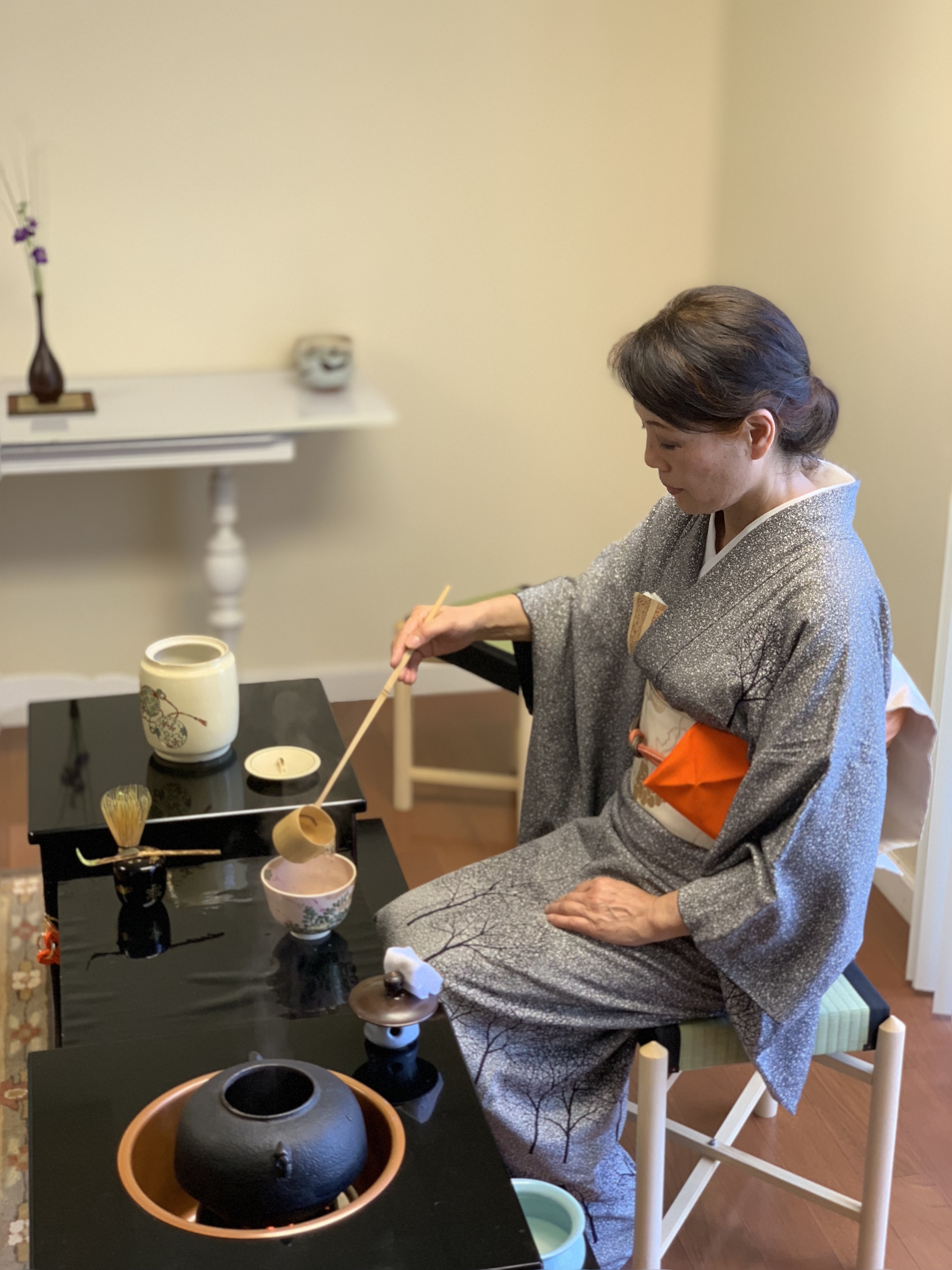 Instead of ordering food from outside, we prepared our own meal with the help of two Junsin-an students. We also made our own Nerikiri sweets and named “ Kiku no Shizuku”, meaning ‘a dewdrop of chrysanthemums’ representing the season. Foods and sweets were delicious and appreciated. We did kasane jawan ( stucked chawan thick tea procedure) and later had thin tea in ryurei style ( host seated at the special table) with Misono dana ( Misono shelf table). This yearly ochaji give us the chance to see everybody and enjoy each other’s tea.We spent this beautiful autumn Saturday afternoon enjoying the tea and company.