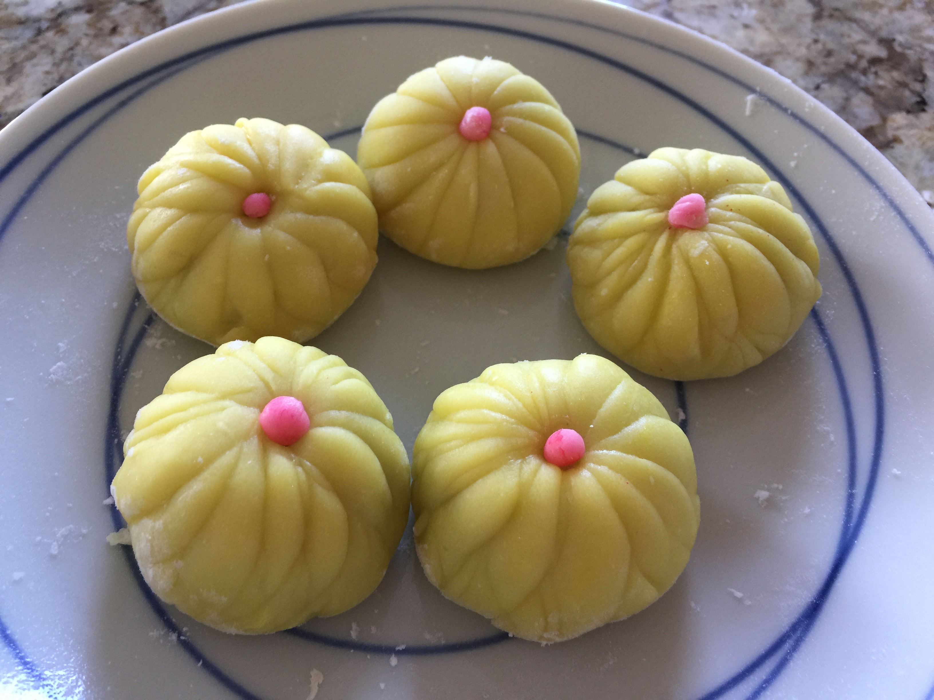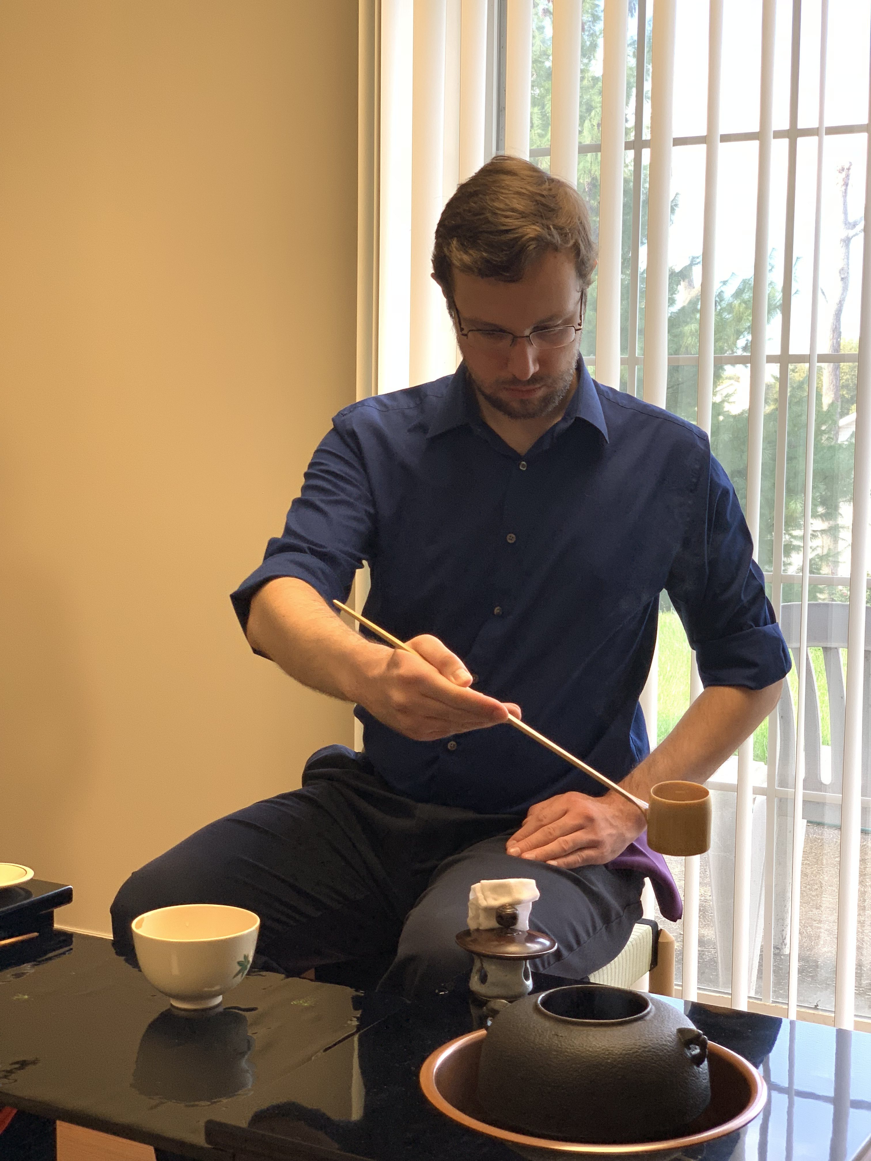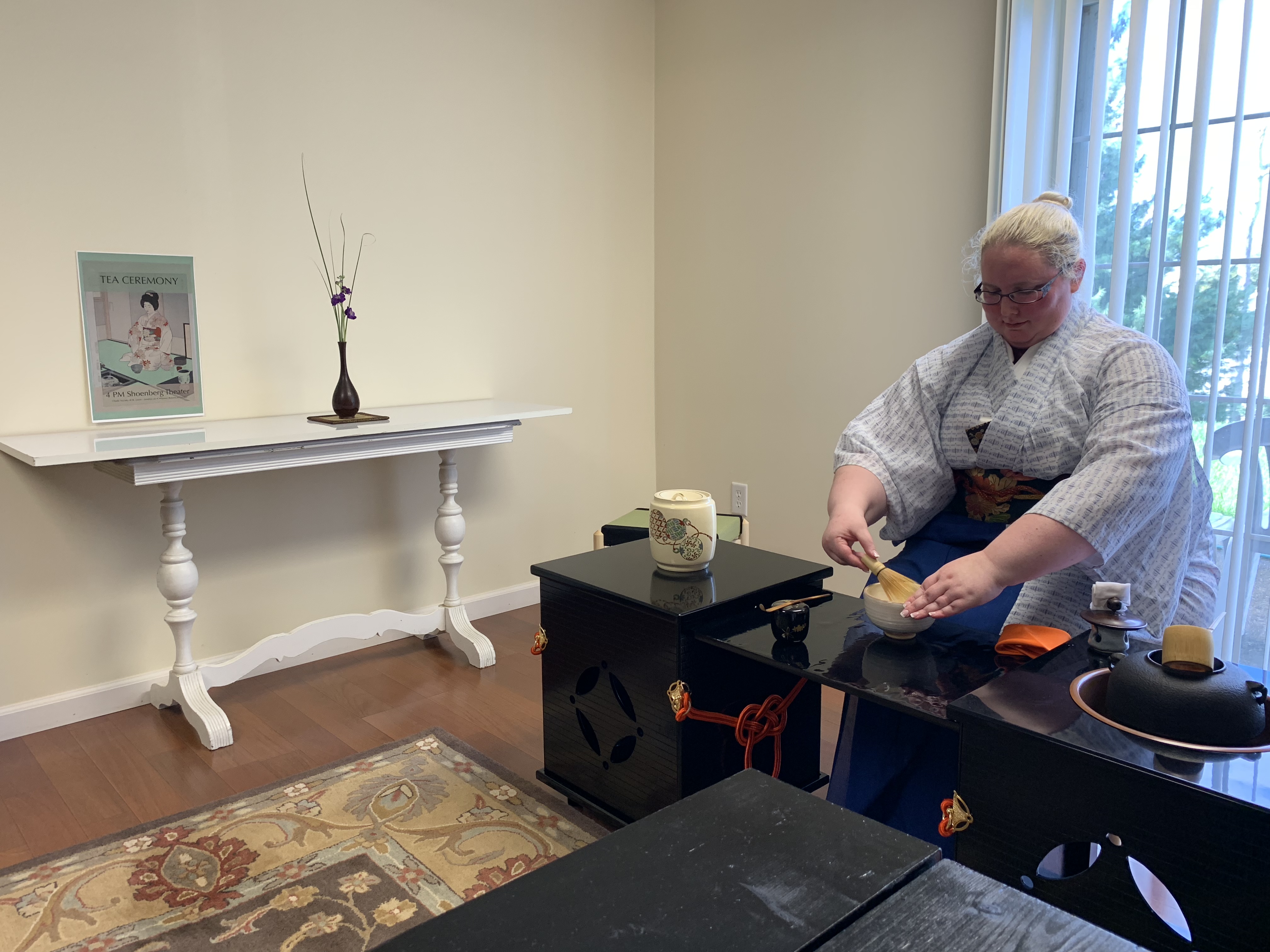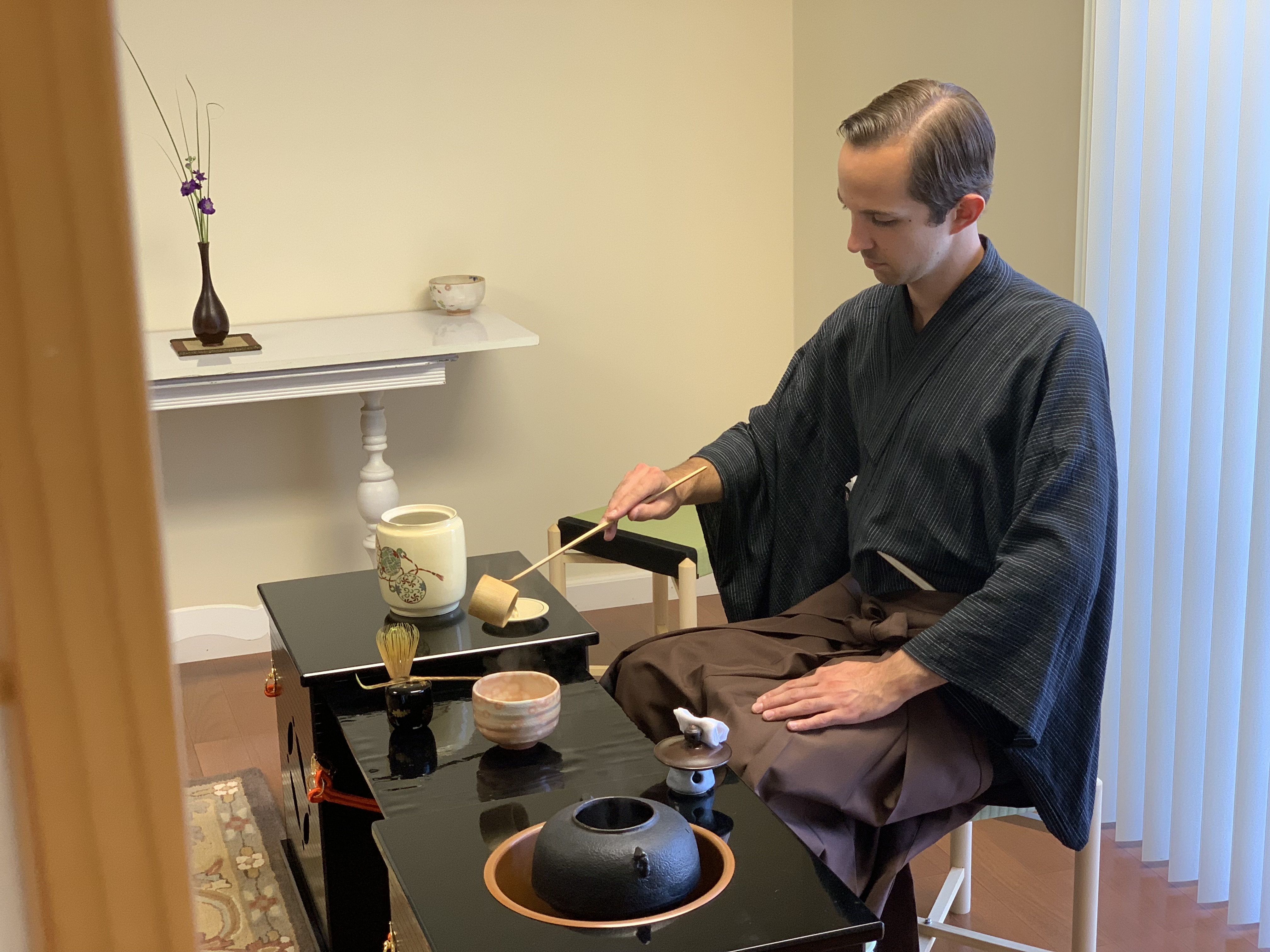 Instead of ordering food from outside, we prepared our own meal with the help of two Junsin-an students. We also made our own Nerikiri sweets and named “ Kiku no Shizuku”, meaning ‘a dewdrop of chrysanthemums’ representing the season. Foods and sweets were delicious and appreciated. We did kasane jawan ( stucked chawan thick tea procedure) and later had thin tea in ryurei style ( host seated at the special table) with Misono dana ( Misono shelf table). This yearly ochaji give us the chance to see everybody and enjoy each other’s tea.We spent this beautiful autumn Saturday afternoon enjoying the tea and company.