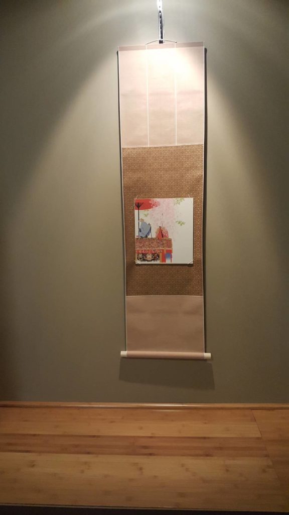 The picture on the scroll depicts the tenth century Japanese poet, Otomo no Kuronush, looking up at a beautiful cherry blossom. This picture, a gift from my friend, seems appropriate for this season.