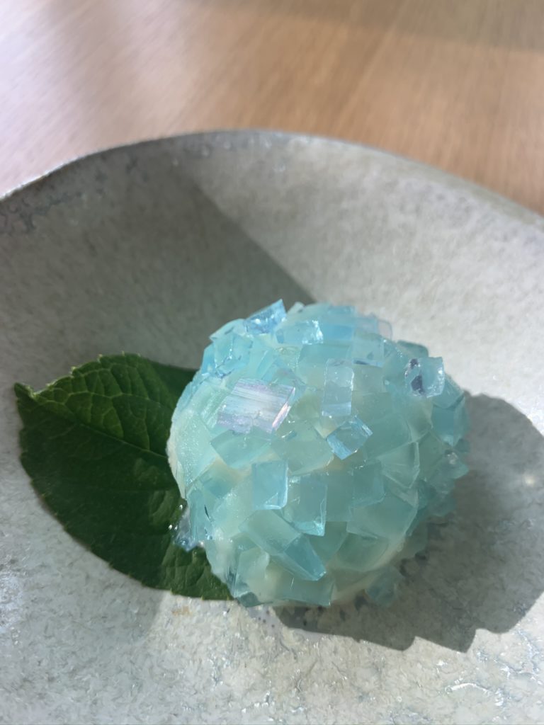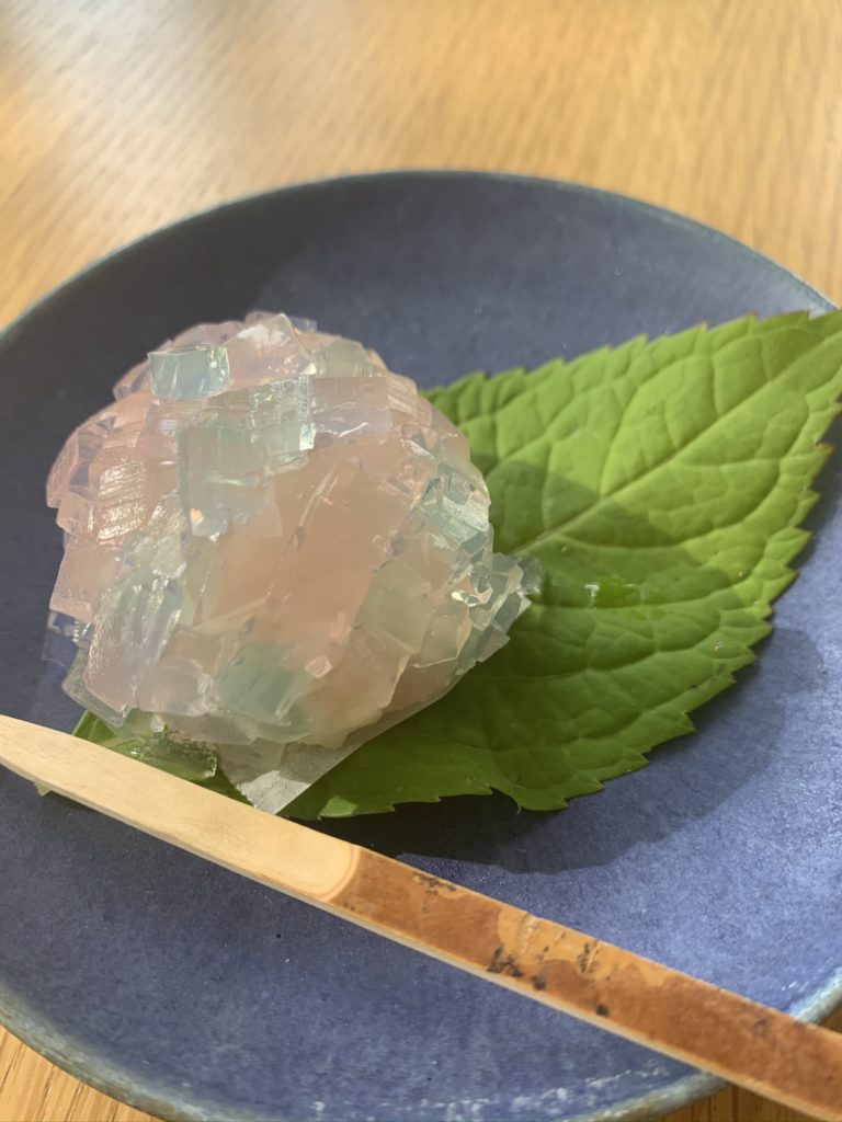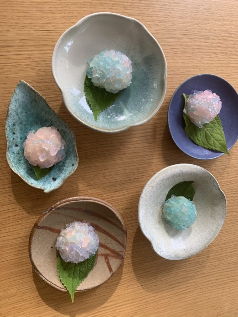 これからアメリカは紫陽花の綺麗な季節です。お茶のお稽古用に紫陽花の和菓子を作ってみました。中は白餡、外側の花びらは、紫陽花のもつ繊細で涼しげな色と光が表せるよう淡い赤、青、紫の小さく切った寒天を使いました。季節の和菓子を愛でていただくのも、お茶の席の楽しみの一つです。