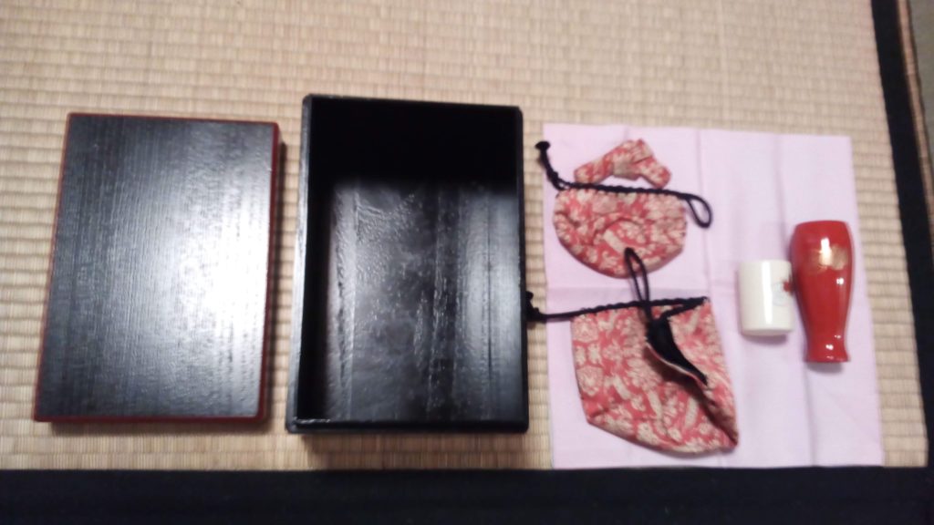 月点前は、十一世玄々斎創案の秋の点前です。他の茶箱点前では使用しない、器据え、ウグイス、香合、小さい火箸を使います。お箱の中からすべてのお道具が箱の蓋と器据えの上に出されると、小羽根の雲の下にまあるい香合の月が出て何とも雅な趣になります。