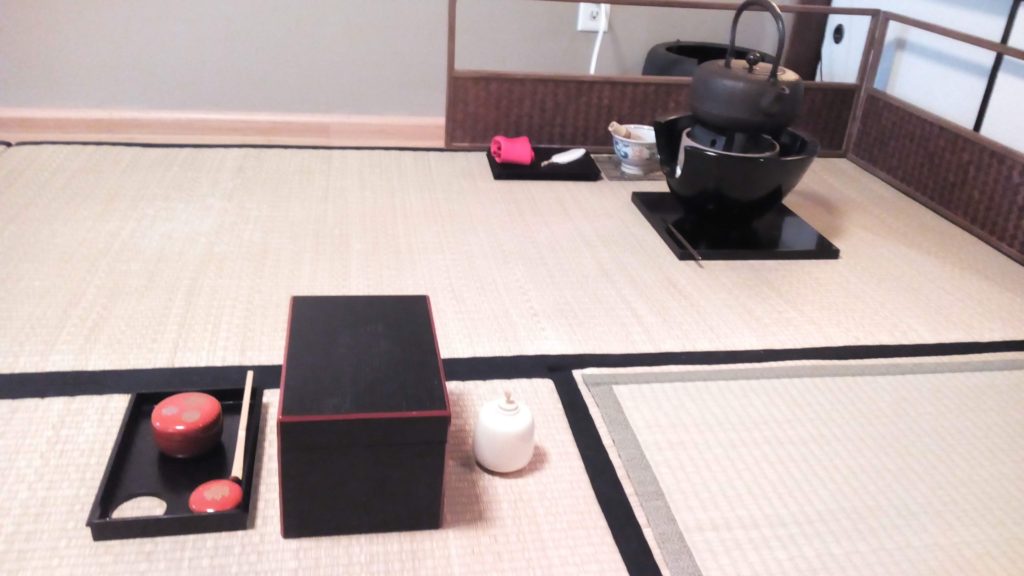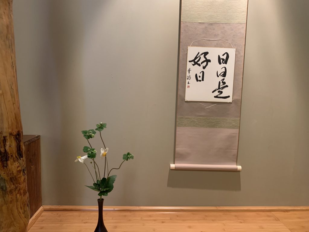 The light from the full moon on October 1st, reflecting on the Japanese pampas grass, was beautiful. Celebrating this fall season, we practiced chabako tsukidemae (chabako box, the moon procedure). We hung the calligraphy nichinichi kore kojitu (“Every day is a good day”) and placed  Japanese anemone flowers in the alcove.