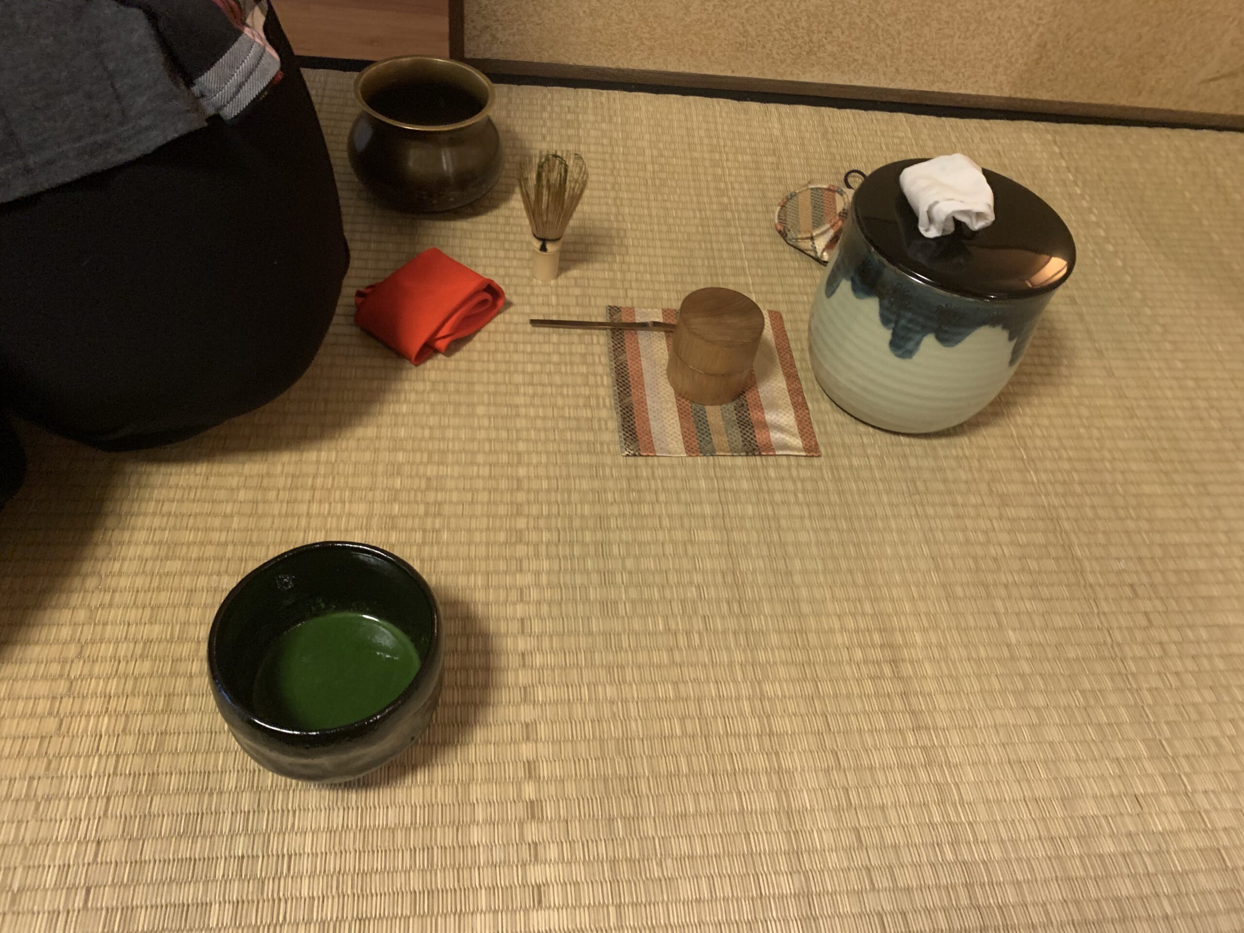 The last practice of the year was wakindate. On the alcove, I hung a scroll that depicted a snowy landscape in Chinese ink. To add a Christmas feeling, I arranged red willow branches with green chrysanthemums and made the nerikiri sweets shaped like a Christmas tree. It is one of the many joys in the tea ceremony where we embrace a season or occasion with tools, art, or sweets.