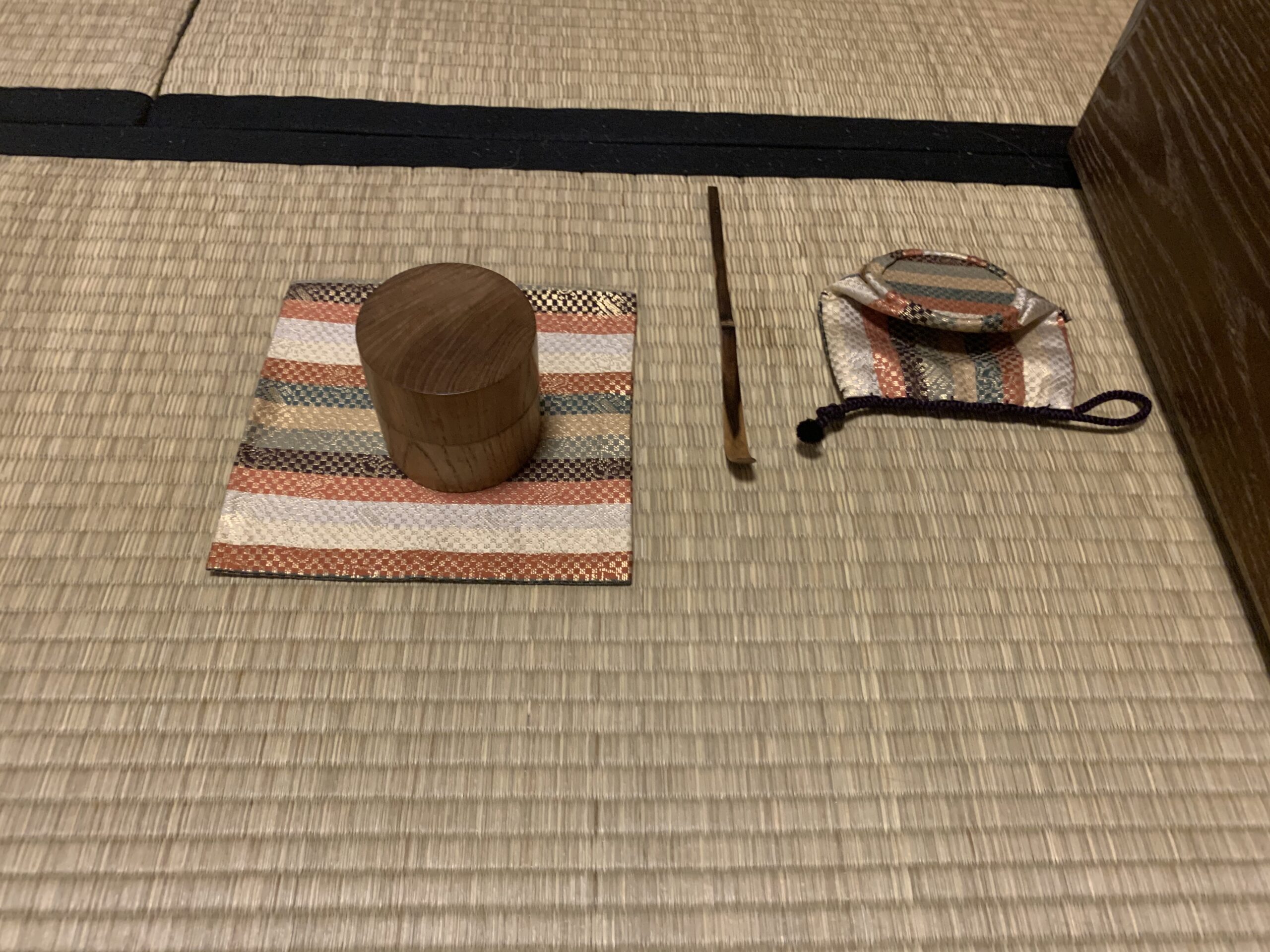 準備は塗り蓋の染付水指の前に、仕覆に入れた欅或いは桑の中次を、仕覆と同じ裂地のお和布の古帛紗の上に載せて荘ります。黒楽茶碗に茶巾と中節の茶杓を仕込み、膝前に置いて行の手をついて襖を開けてお点前が始まります。このお点前は中次茶入れとお和布にフォーカスしますので、茶入れを扱う時は手を副える、お和巾は左手前の和巾を右手でつまみ上げてからそこを左手で持ち、右手はすべらせて・・・といった一連の動作で扱うことを習得します。この和巾の裂地は (1)「東福門跡より拝領した唐松鈍子」或いは(2)「光格天皇の御衣の裂地の伊予簾鈍子」という設定ですので、とても貴重で稀有なものを扱うお点前なのです。