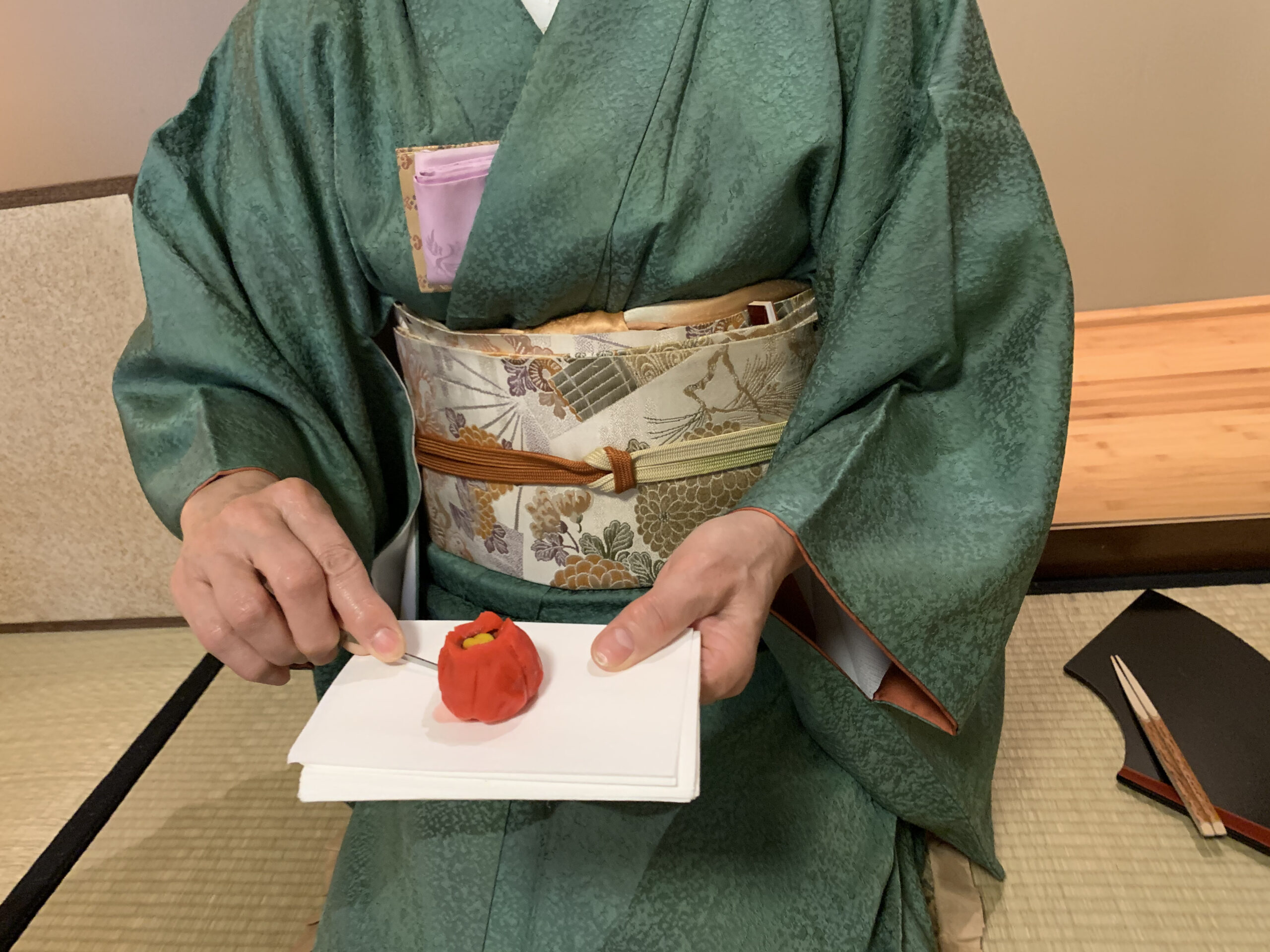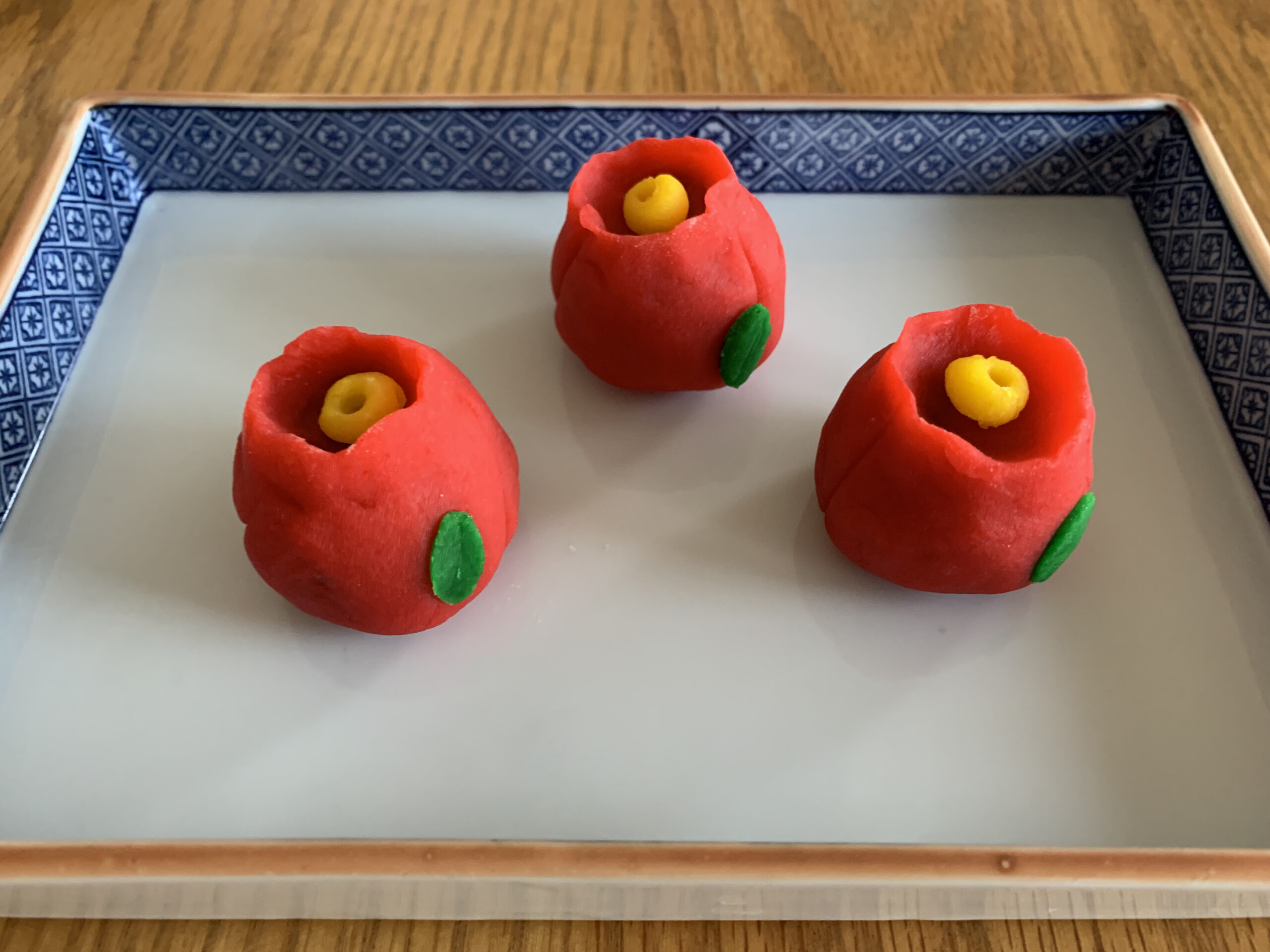 In the first week of March, one of my students and I made nerikiri, which we nicknamed “red camellia.” In Japan when we go out during winter and spring, blooming camellias, beautiful red flowers with shiny green leaves, are often spotted. Since none of these traditional and frequently-used flowers are now in bloom in St. Louis, we created one as a sweet, and instantly it has brightened up our tearoom.