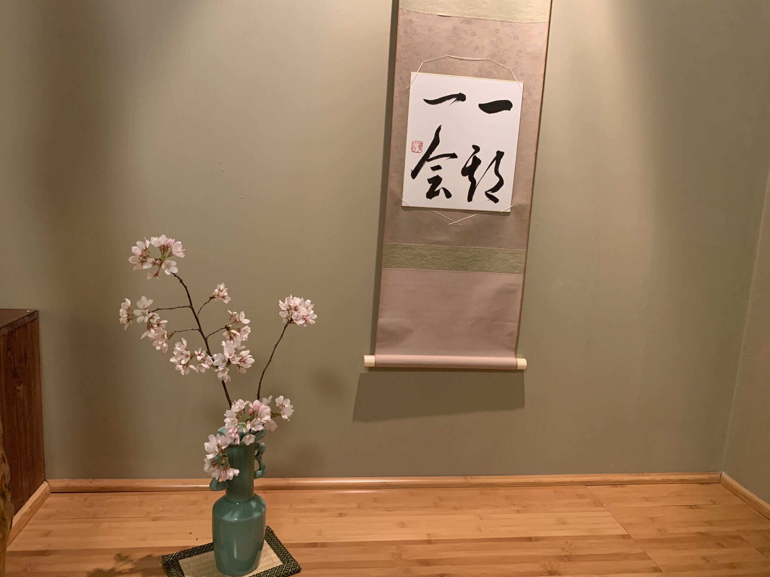 The cherry blossoms were in full bloom. I cut one of the tree branches from my garden and placed it in the alcove. The writing on the scroll I hung beside the flowers was ichi go, ichi e (one time, one encounter). These words mean cherish each meeting and each moment of life because no experience will ever be repeated.