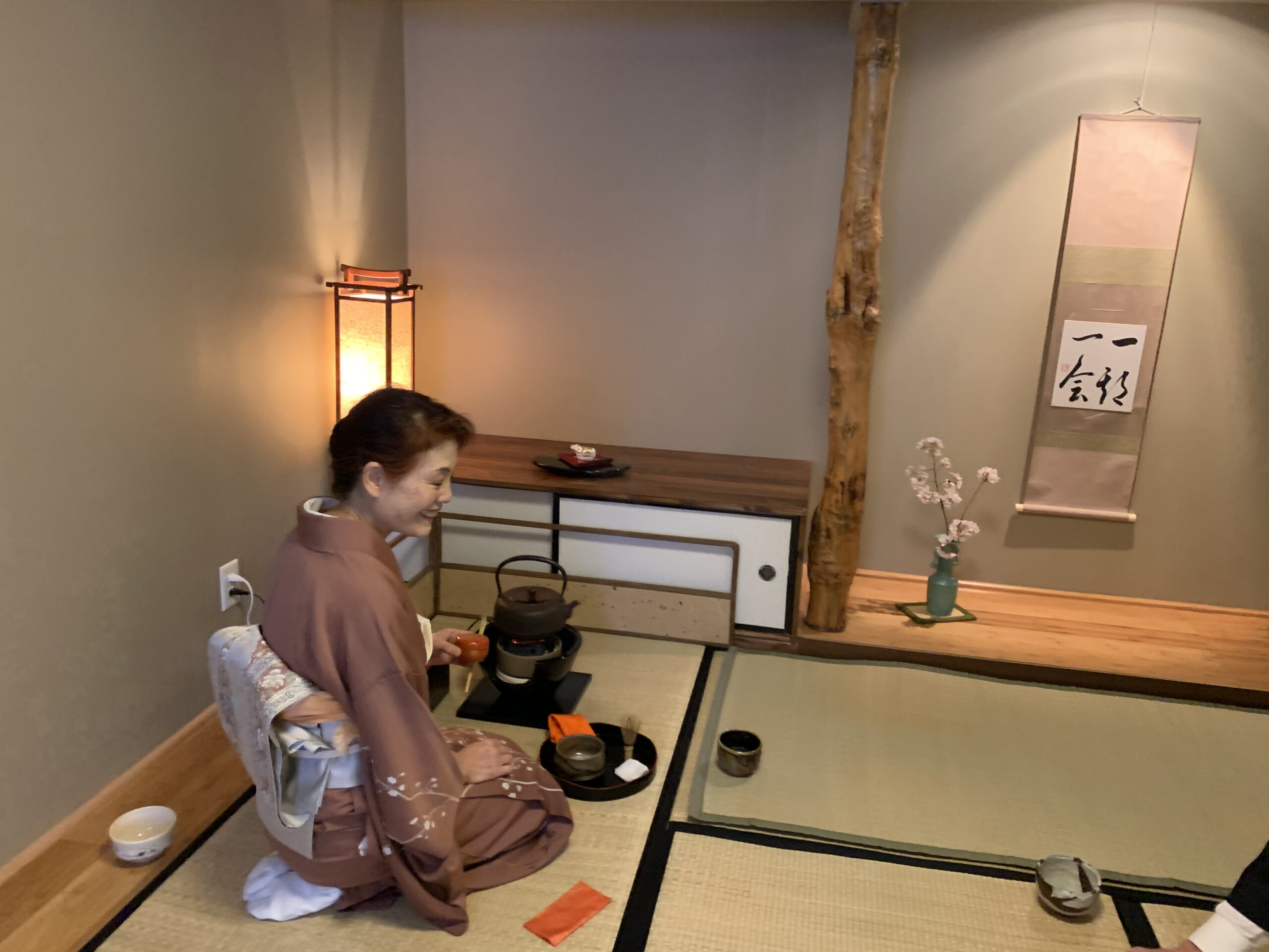 お客様が来られた日は我が家の庭の桜が満開。”桜切る馬鹿•••”の諺に逆らい、ひと枝切って床の間に飾りました。お軸は『一期一会』。二度と来ないこの出会いとひとときを大切にしたいという思いを込めました。