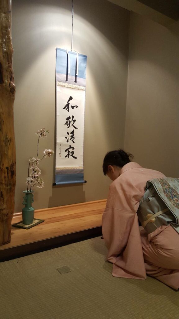 Still, we were anxious and not sure how well the whole ceremony would look through a camera. Beforehand, we had sent pictures of the flower and scroll in the alcove, and on that day of the presentation, we explained about them and then demonstrated how to receive and drink tea from a teabowl.