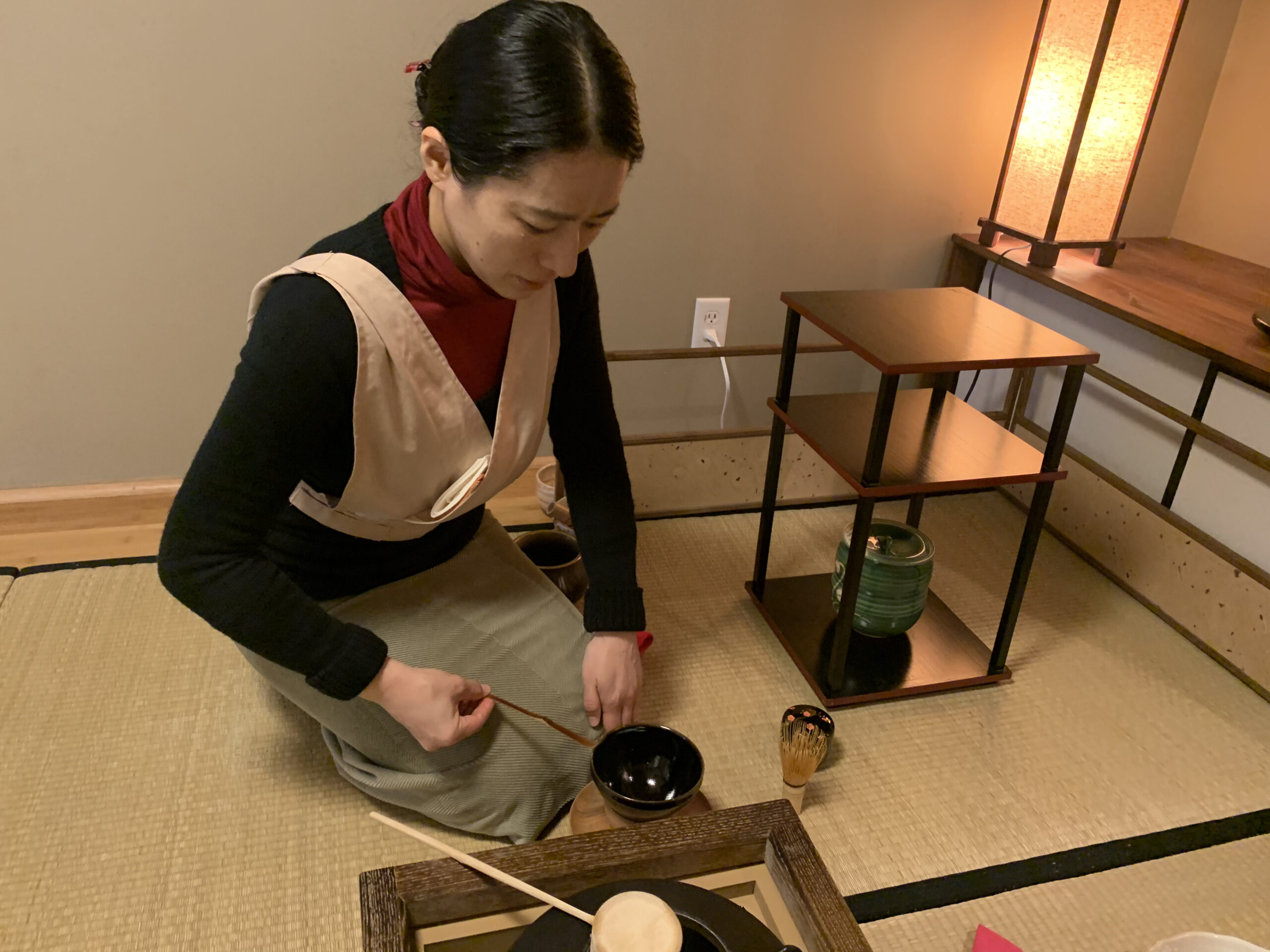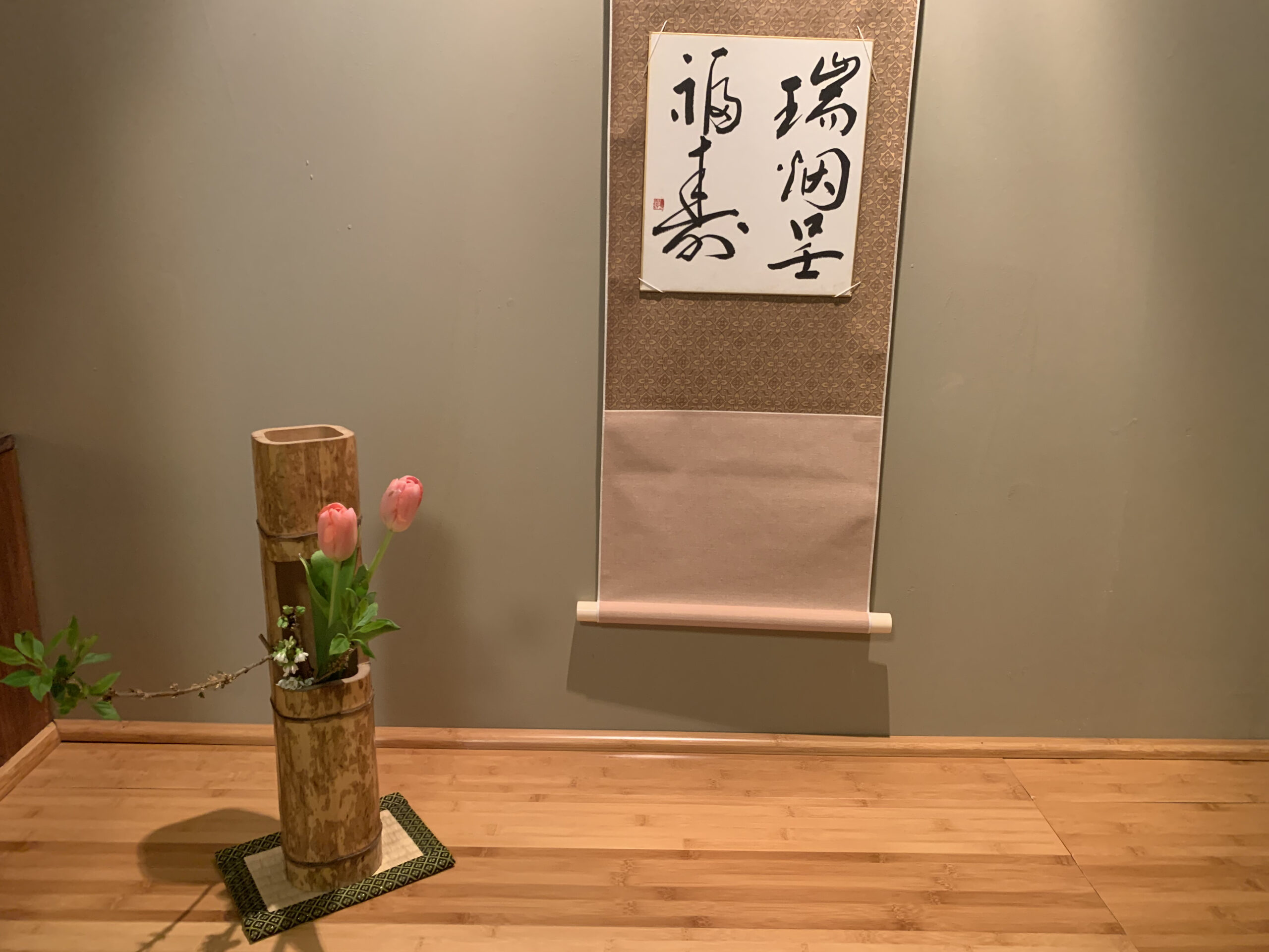 Recently, we practices two procedures: kinindate (for a nobleman) and kinin kiyotsugu (for a nobleman and someone who accompanied him). In the alcove I placed a tulip and a pear tree branch and then hung the scroll with zuienfukuju wo teisu, calligraphy that means “we lead a full life when we have many small experiences that bring happiness.”