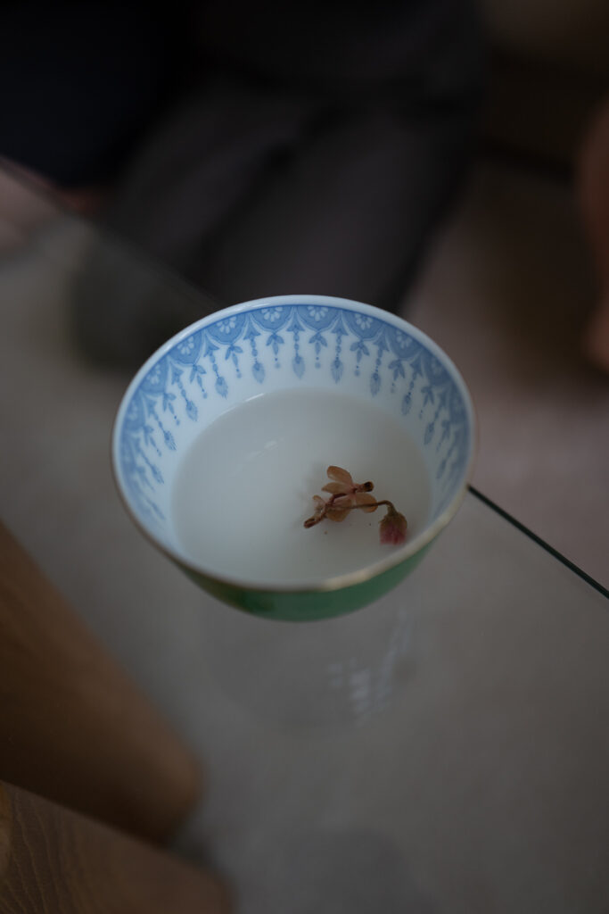 The last course was our handmade nerikiri, opening peony flower, which we named hyakka no oh meaning the “king of all flowers.” After the meal, skipping the sumidemae (charcoal procedure), the guests left the tea room for a short break.