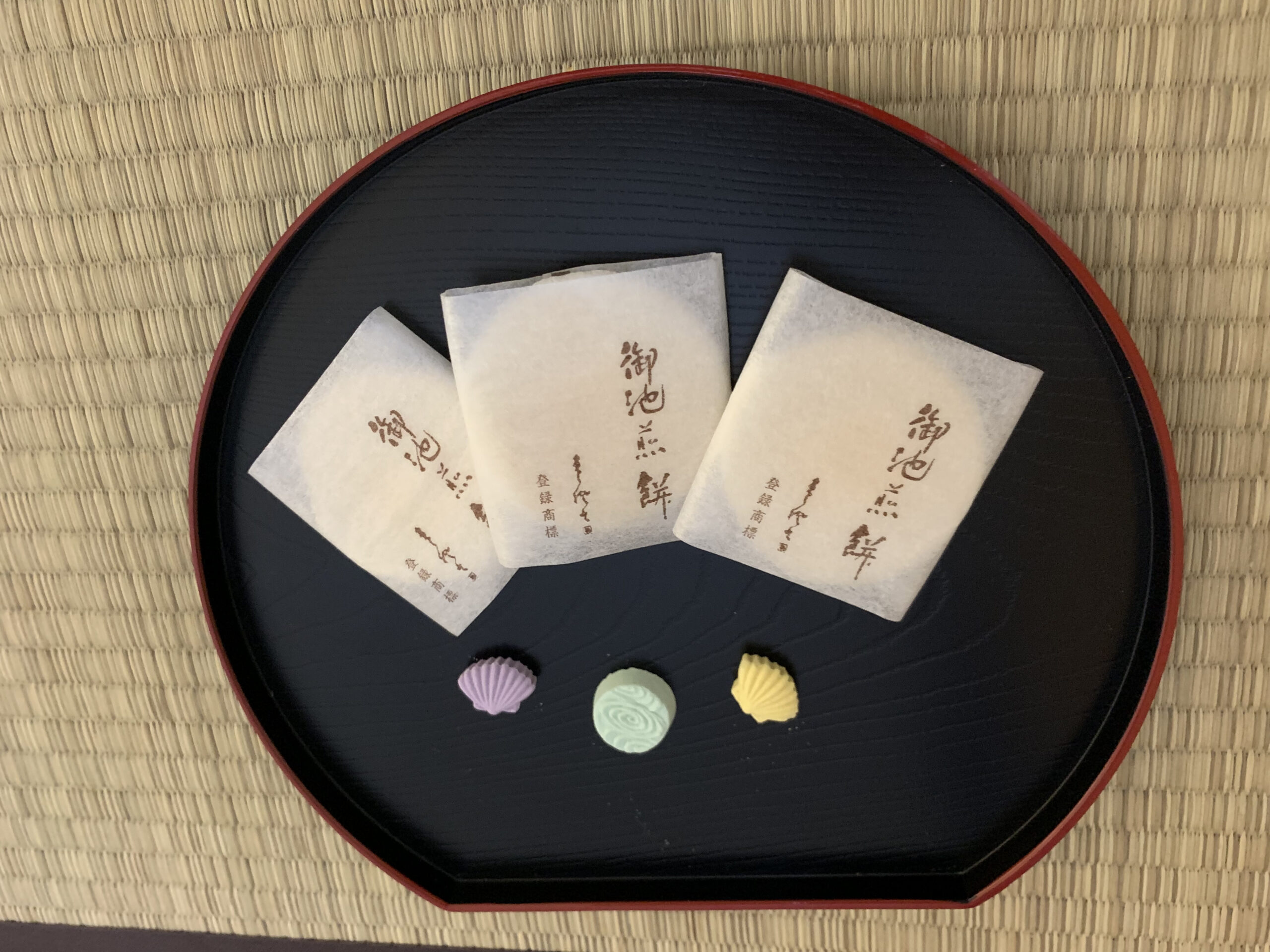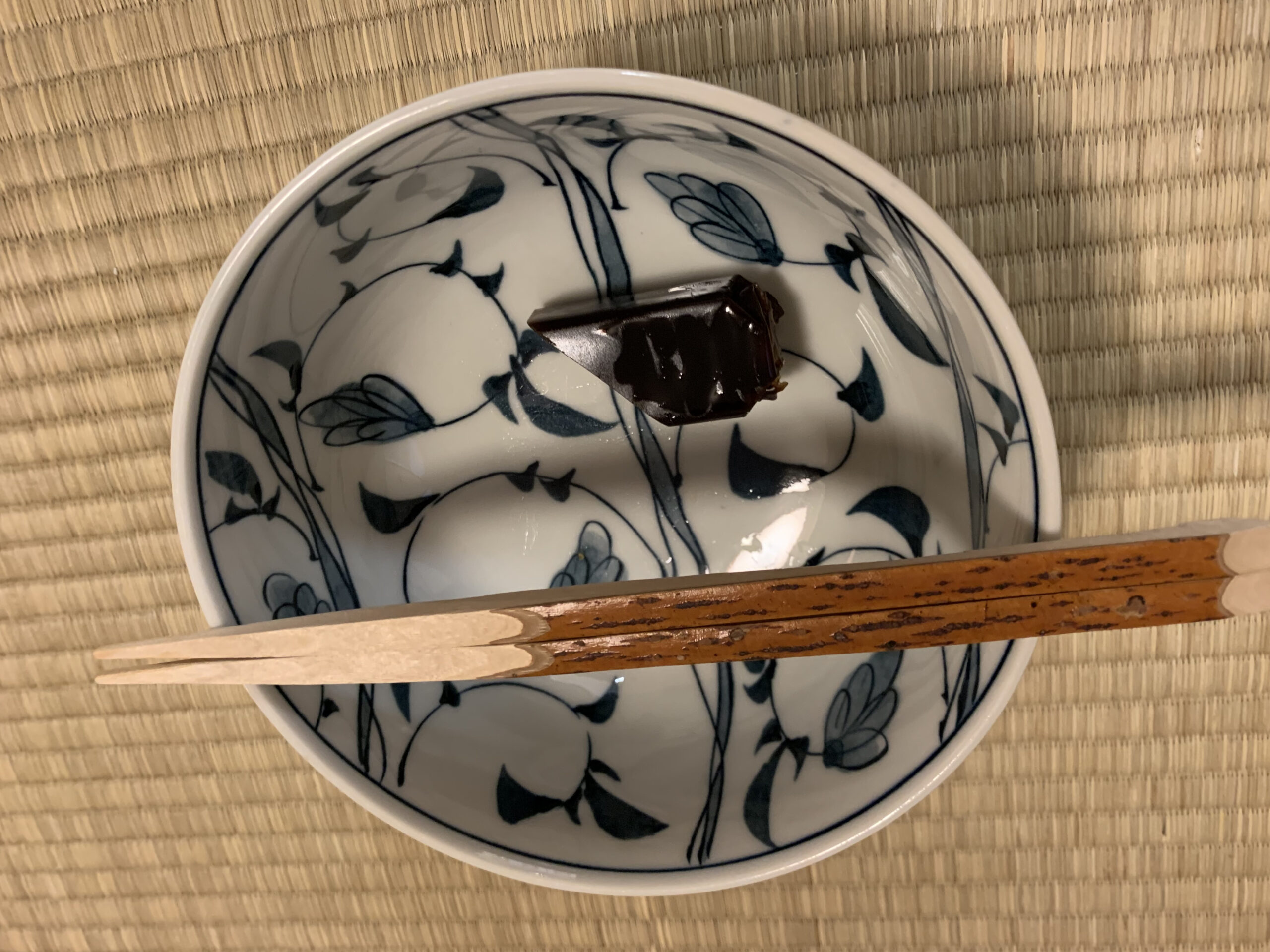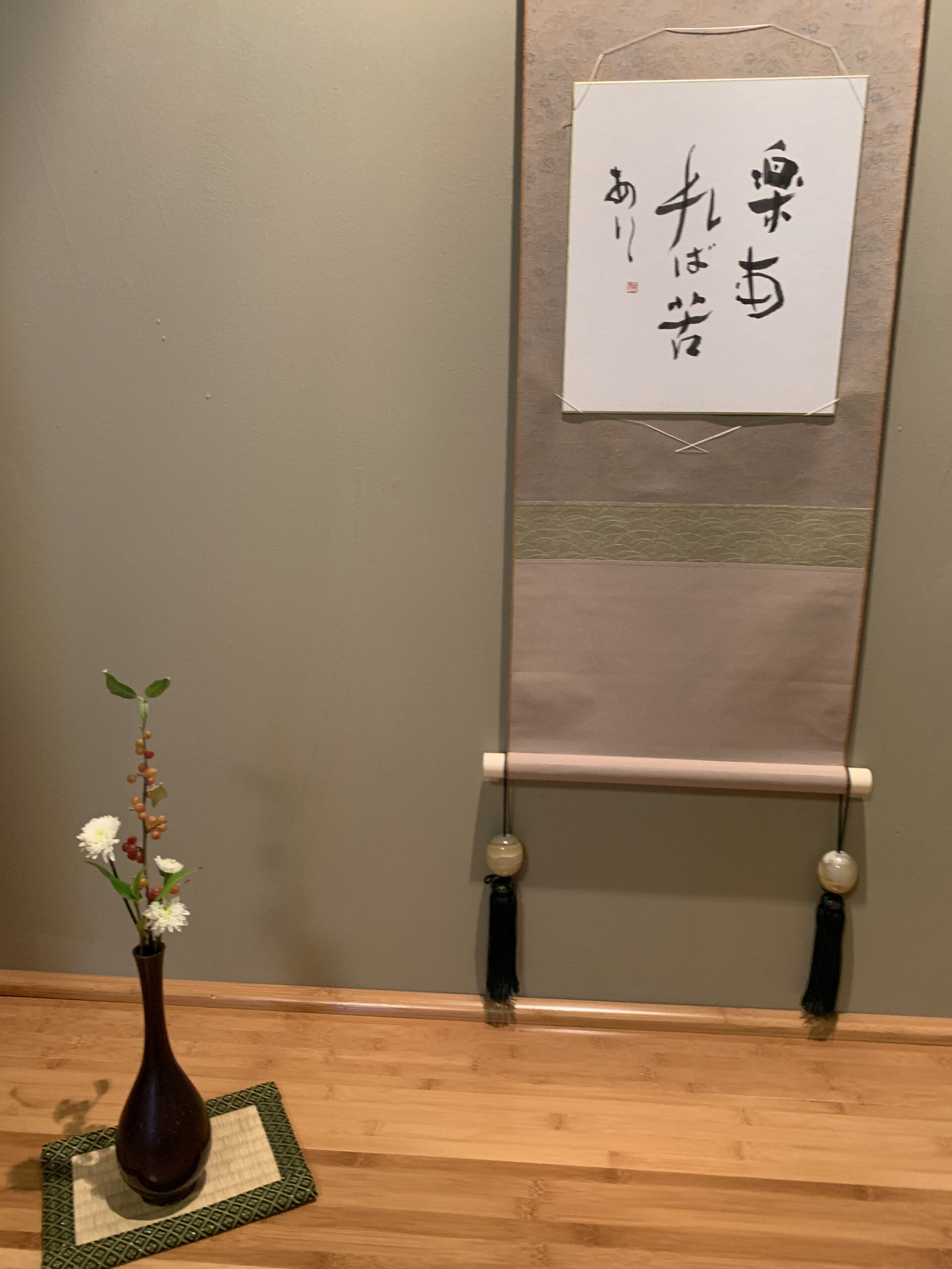 お軸は『楽あれば苦あり』。楽しいことの後には苦労もやってくる。人生とは苦と楽が相伴うものである。お菓子は、日本帰りの生徒さんからお土産にいただいた虎屋の羊羹と、亀谷良永の御池煎餅です。