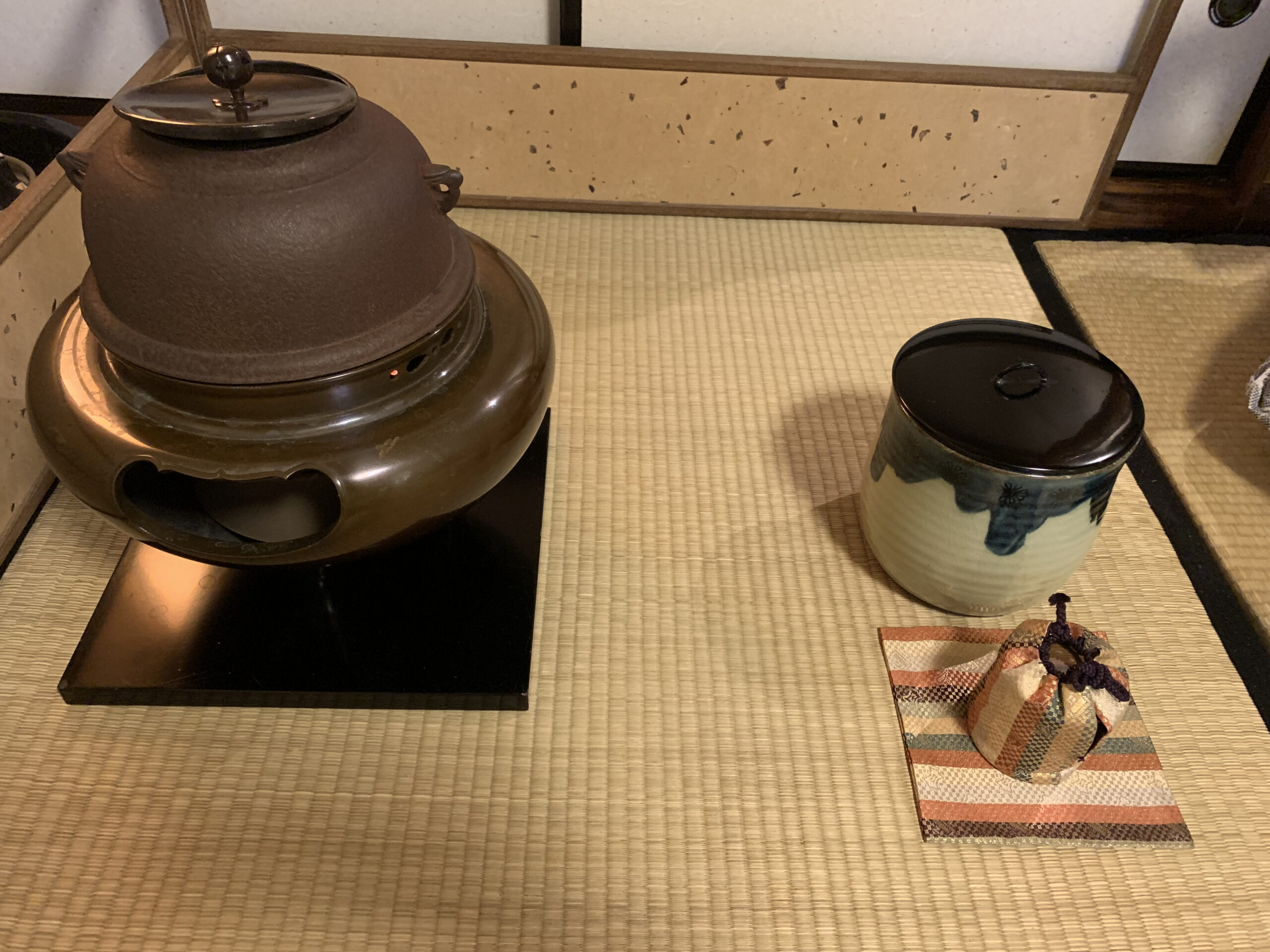 準備は染付、塗蓋の水指、和布と同様の裂地の仕覆に入った中次茶入、和布、黒楽茶碗、中節茶杓。