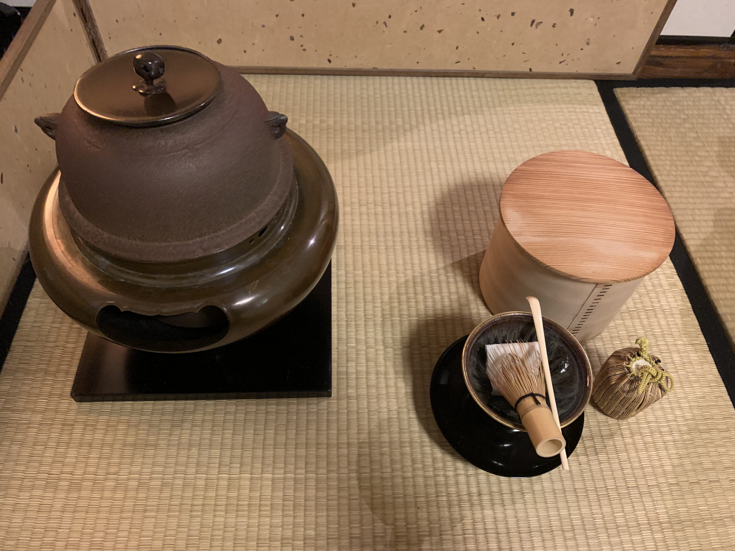 After a few years of shikaden practice, students are beginning to understand what tool to prepare before the ceremony. Each procedure is different depending on the tools used. Since the main tool in daitenmoku procedure are the tenmoku chawan and tenmokudai, we learn how to clean and handle them properly: for example, we support the chawan with the left hand when pouring the hot water.