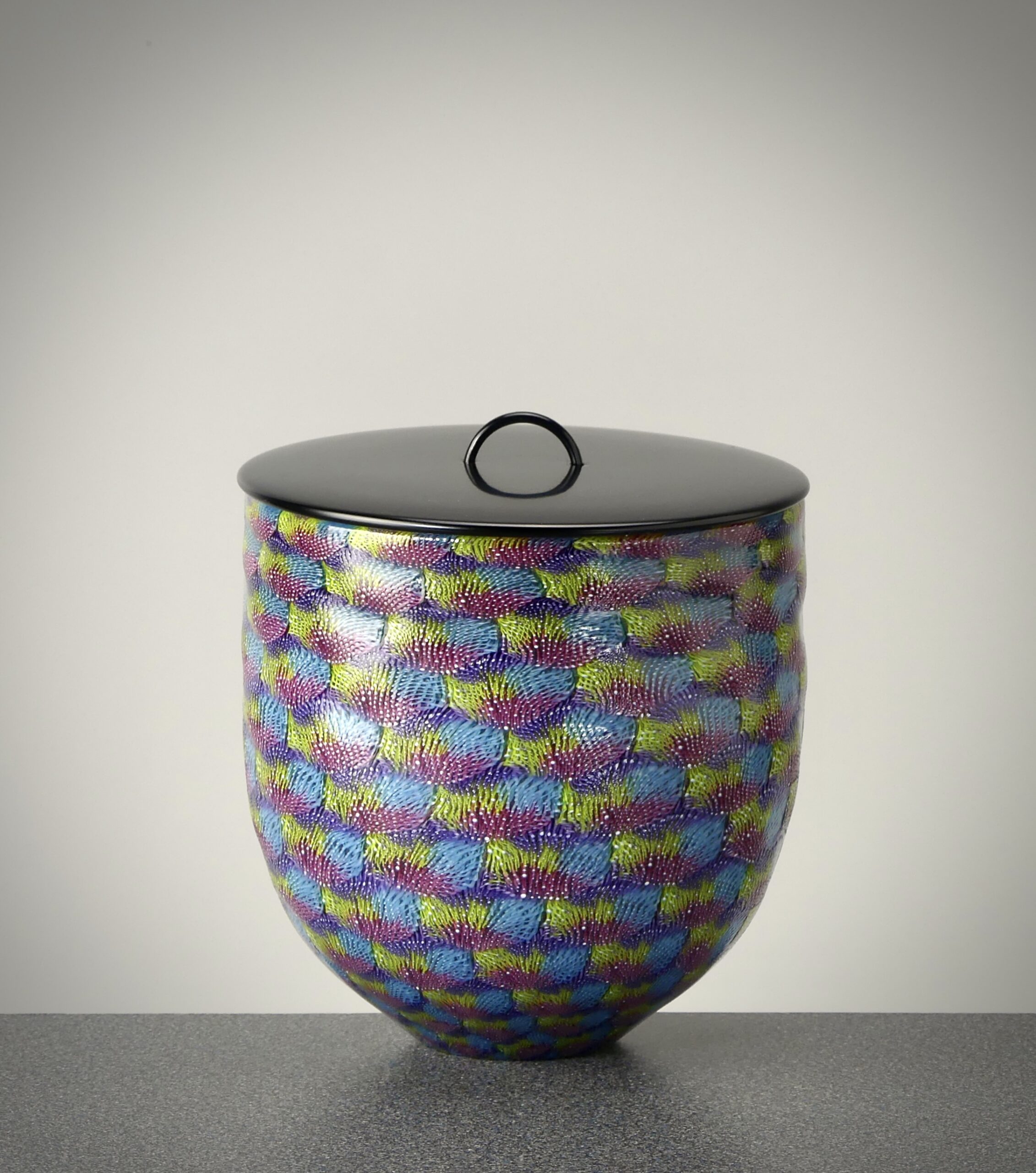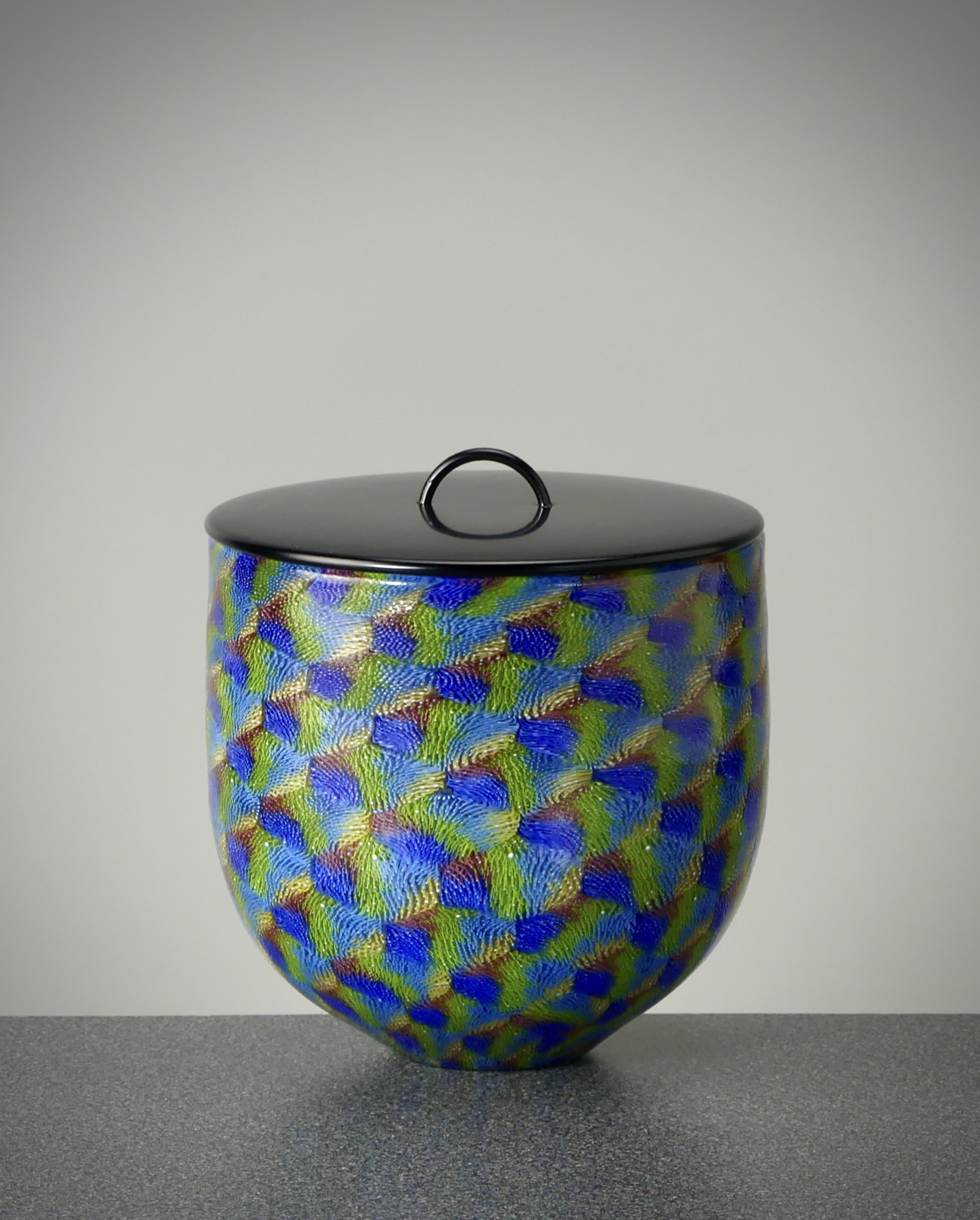 同じ社中のお茶仲間でもあるミズーリ在住のガラス工芸作家、前畑佳永子さんが私たちからの要望に応えて茶箱用の振り出しと茶巾筒、水指を作ってくださいました。イタリアのムリーニガラスの手法や、レースガラスの手法を使っている前畑さんの作品は、色彩豊かで美しく、それでいて日本の茶道具ともしっくりと溶け込みます。水指には、日本から取り寄せた黒真塗りの木蓋がついています。