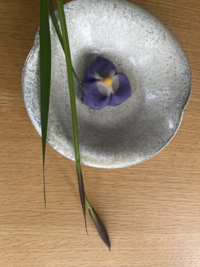 お菓子はこの季節定番の『あやめ』の練り切りです。前日に、お客様用と5月のお稽古用に40個余りを今やプロ並みの腕前になった生徒さんと二人で作りました。