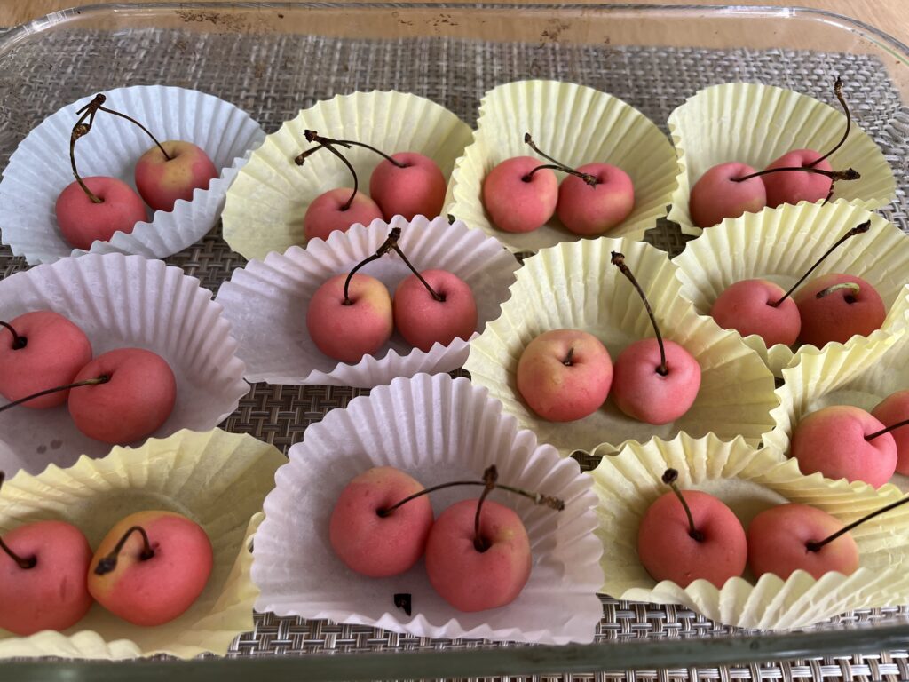 夏になると、アメリカのスーパーにはチェリーが並び始めます。ほとんどは、色の濃いいわゆるアメリカンチェリーと言われる種類のものですが、時には日本のさくらんぼに似たレイナーと呼ばれるものもよく見かけるようになりました。今回は、そのヘタをとっておいて、日本のさくらんぼの形を作ってみました。他の練り切りに比べて作るのは簡単ですが、生徒さんたちからは、形が可愛いととても喜んでもらえました。