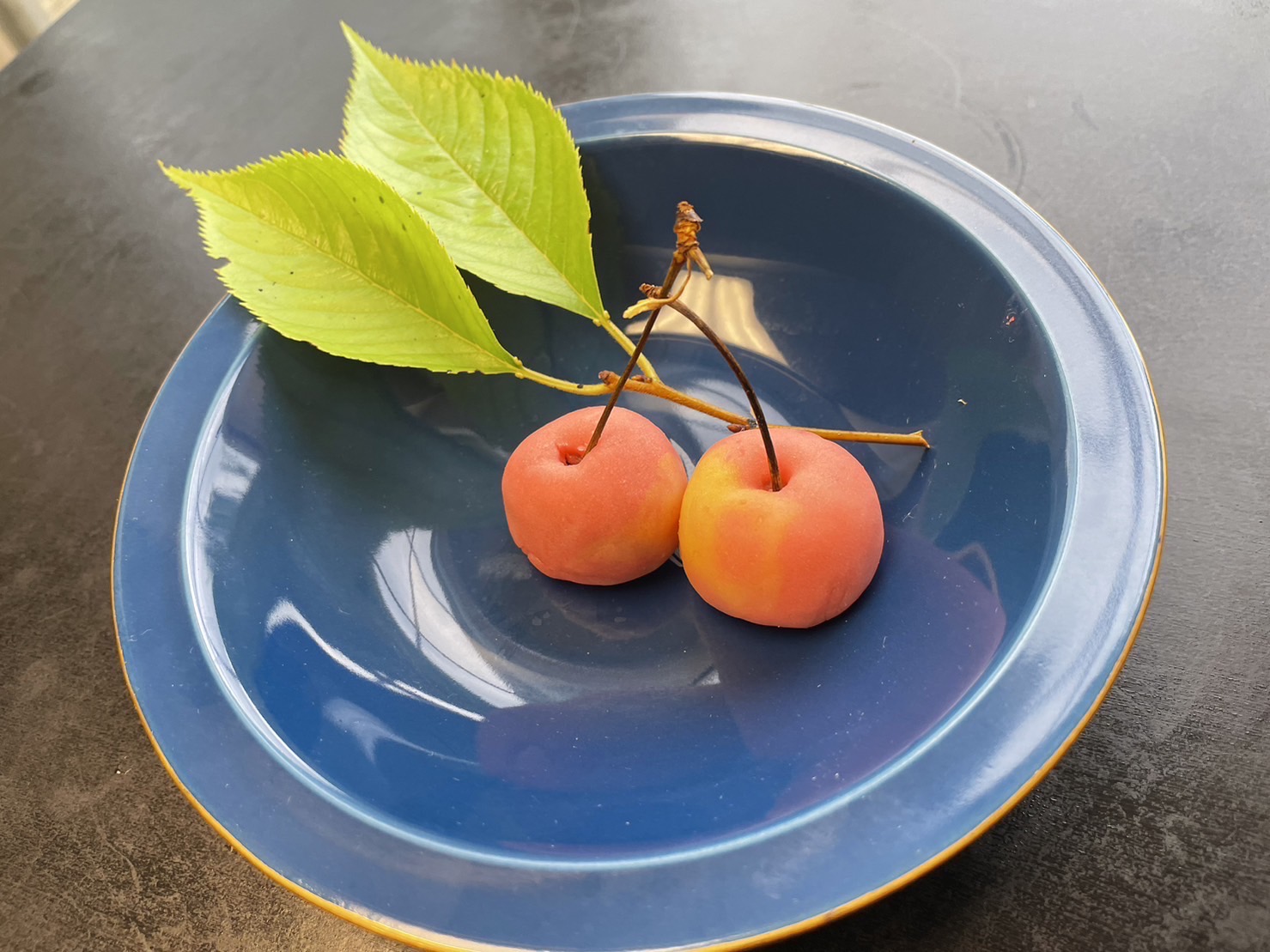This month we tried to create a wagashi sweet that looks like Rainer cherries. With the stems from real cherries, they looked more realistic and fresh and became one of the favorite wagashi we made.