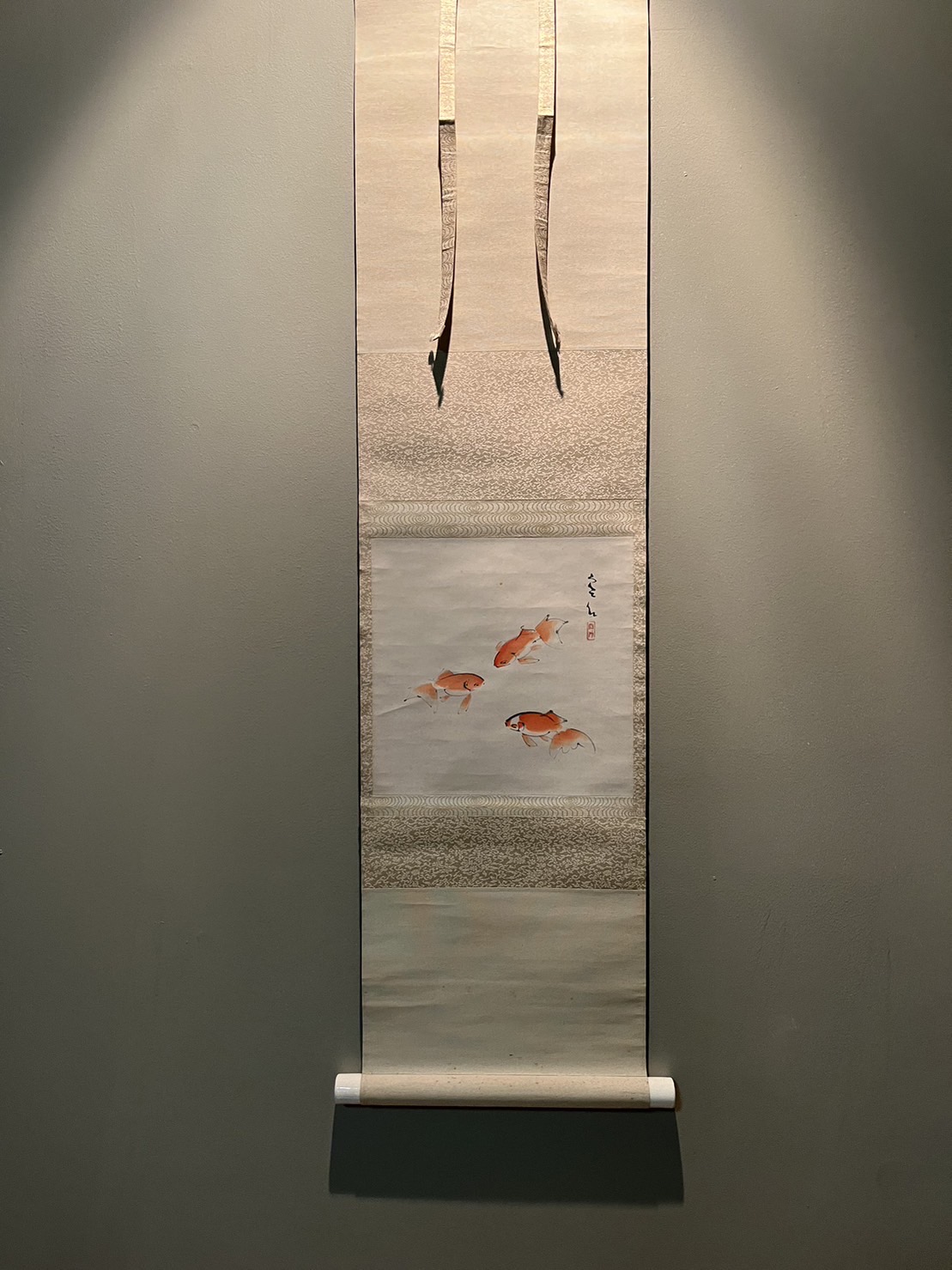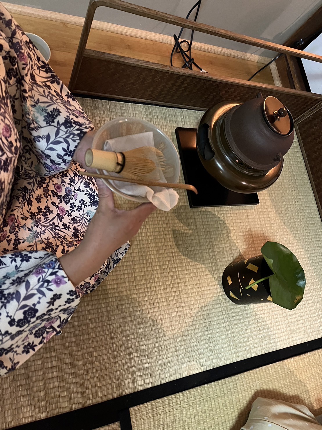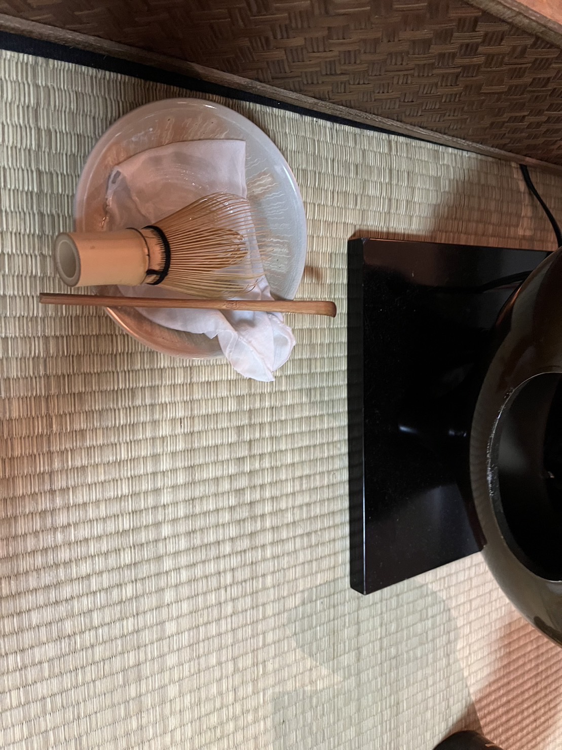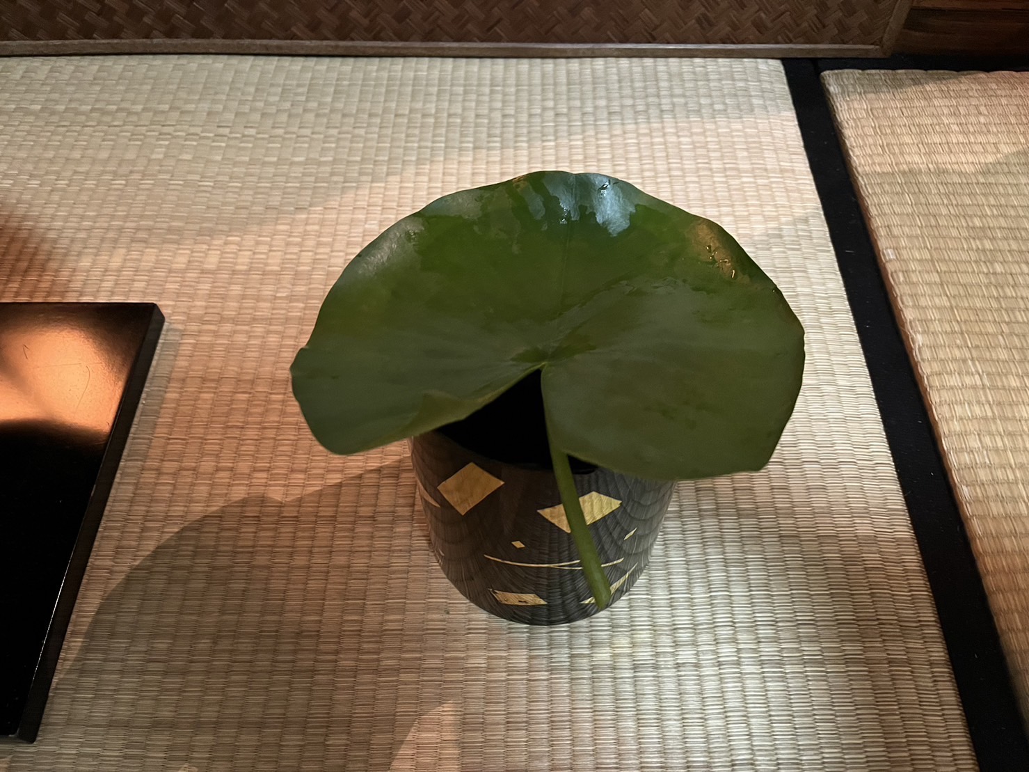 We are experiencing extremely hot weather in the Midwest this summer, so we practiced habuta and arai-jakin procedures to create a cool atmosphere. Many lotus flowers have been blooming in my small pond this year, spreading the lively green leaves over the water. I picked some of these leaves and used them as a lid for the water container. We placed the chakin in the hirajawan filled with cold water. With these leaves and chakin in the water, we felt the cool breeze in the tearoom. I’m always impressed by the 11th Iemomoto Gengensai’s idea to enjoy each season—even the hottest one.