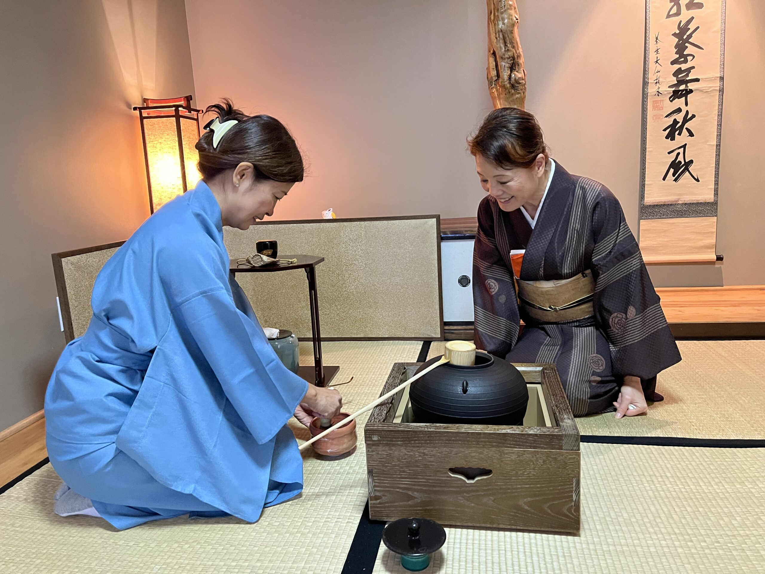 Since it’s been six months since our last hearth tea practice, today we reviewed and confirmed the fundamental positions and procedures for thin tea (Usucha) in front of the hearth, such as the placement of utensils and the etiquette for the host and guests.