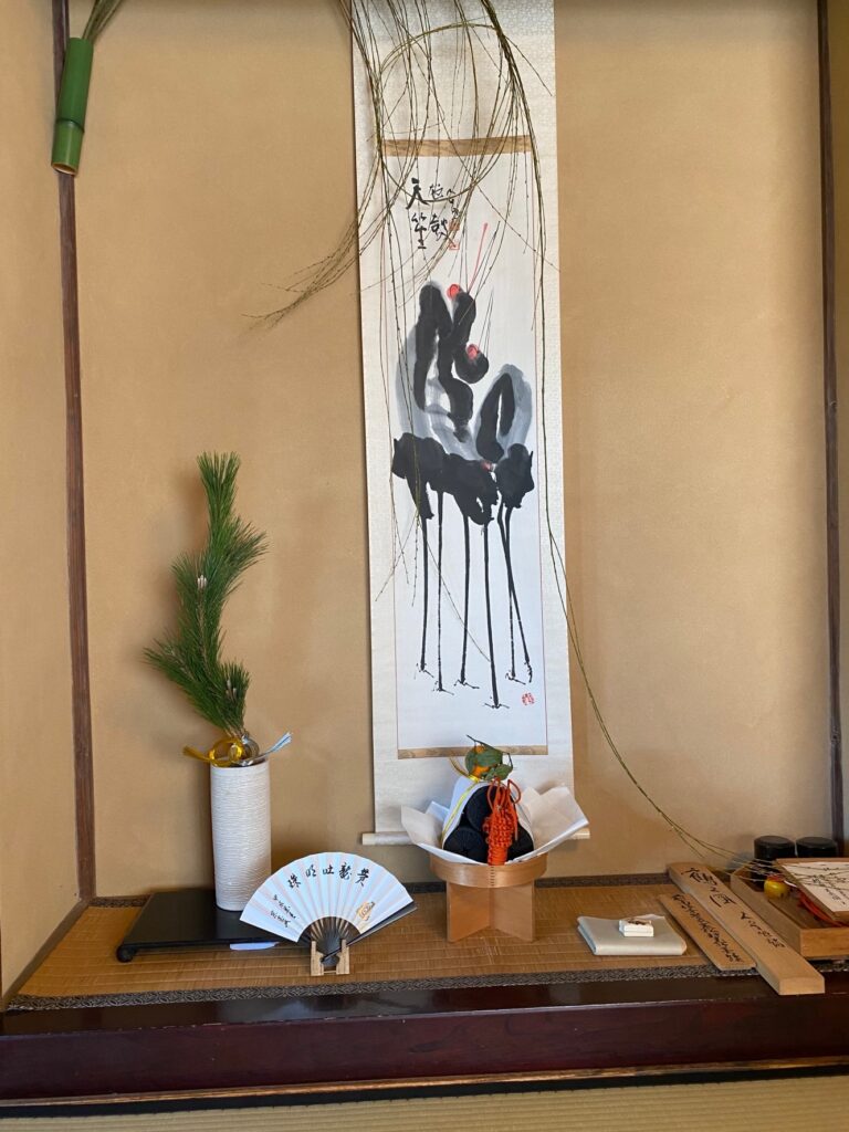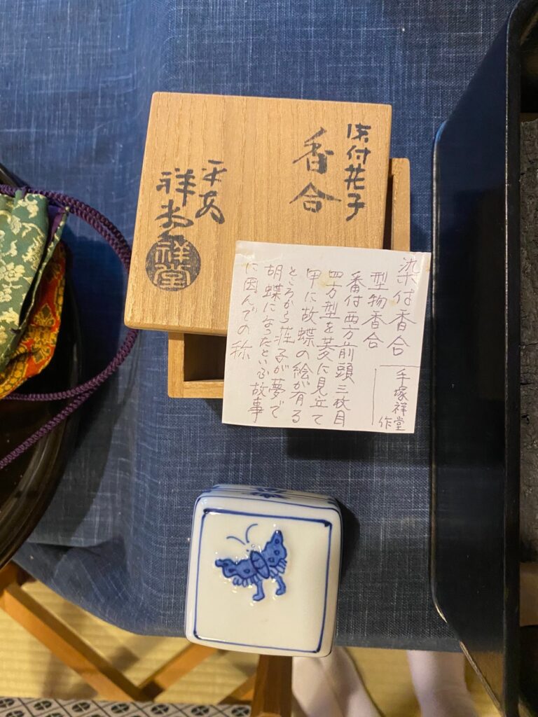 I had a tea lesson at the home of my new tea ceremony teacher in Osaka, a close friend of my long time teacher, Hayashi sensei. Her grandmother and mother were also tea ceremony teachers, and I had the pleasure of admiring the various exquisite tools that have been passed down. Among them were numerous Tenmoku tea bowls, a calligraphy scroll by the Grand Master, incense containers, and more. Also there was a fan with the phrase “Dragon Spitting out the Pearl,” personally written by the Grand Master. This signifies that enlightened leaders always speak of a transparent truth without impurities.