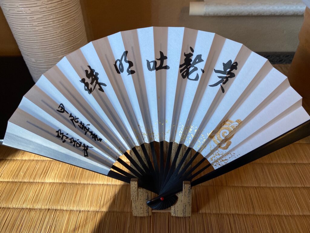 『黄龍明珠を吐く』(こうりゅうめいじゅをはく)とお家元の手で書かれたお扇子。聖人君主は常に穢れの無い透明な真実を語っている、教えてくれているという意味だそうです。