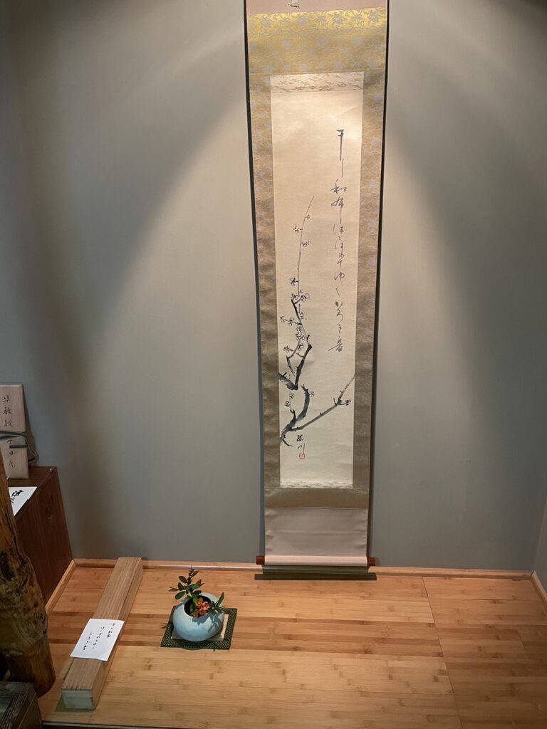 The scroll features a haiku composed by my father-in-law, “Drying wafers, carried away, a light sound,” along with a picture of plum blossoms. Both the calligraphy and the painting were done by my father-in-law.
