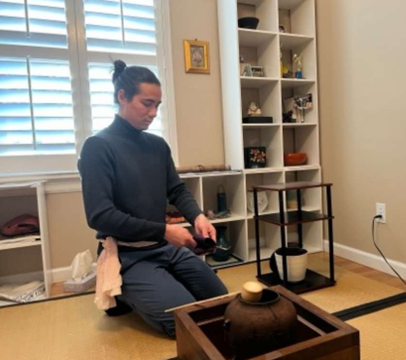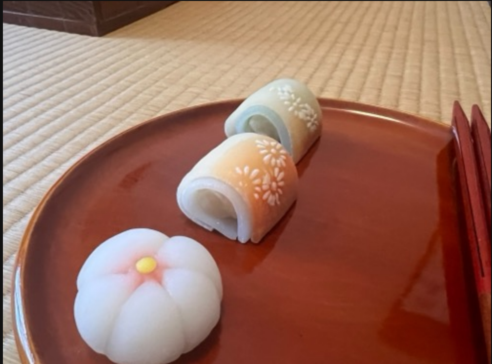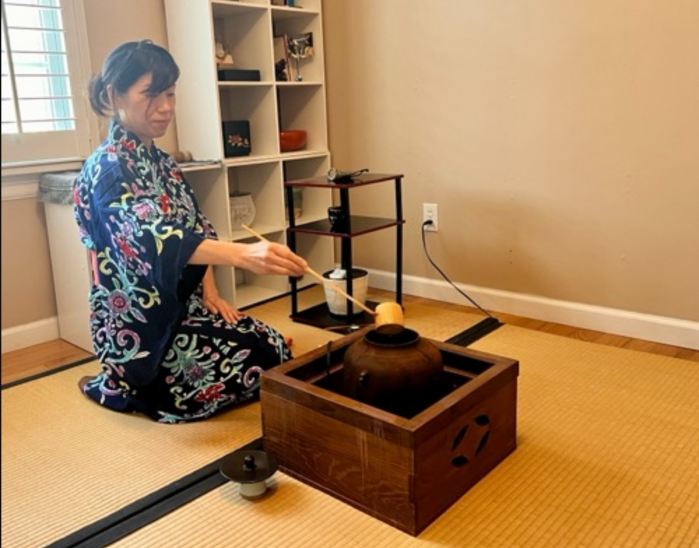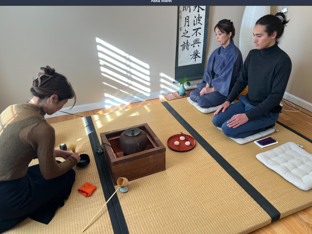 Every year, during the winter when our teacher returns to Japan, the students gather to practice on their own. However, this year, due to the flu and cold weather spreading, as well as bad weather conditions, progress has been slow. Just like last week, St. Louis had snow again this week. This year, we changed the location and held our practice at a different house, but even in an American bedroom, when tatami mats are added, it strangely creates a sense of a Japanese room. When a hearth is placed in the room, it almost feels like being in Japan. On this day, although the frozen snow remained outside, inside the room, steam rose from the ladle filled with hot water, almost like smoke, creating a warm and comforting moment. For sweets, we enjoyed uirou sweet, shaped and named Fuku-ume (lucky plum), and Akane gasane (Kimono Pattern).