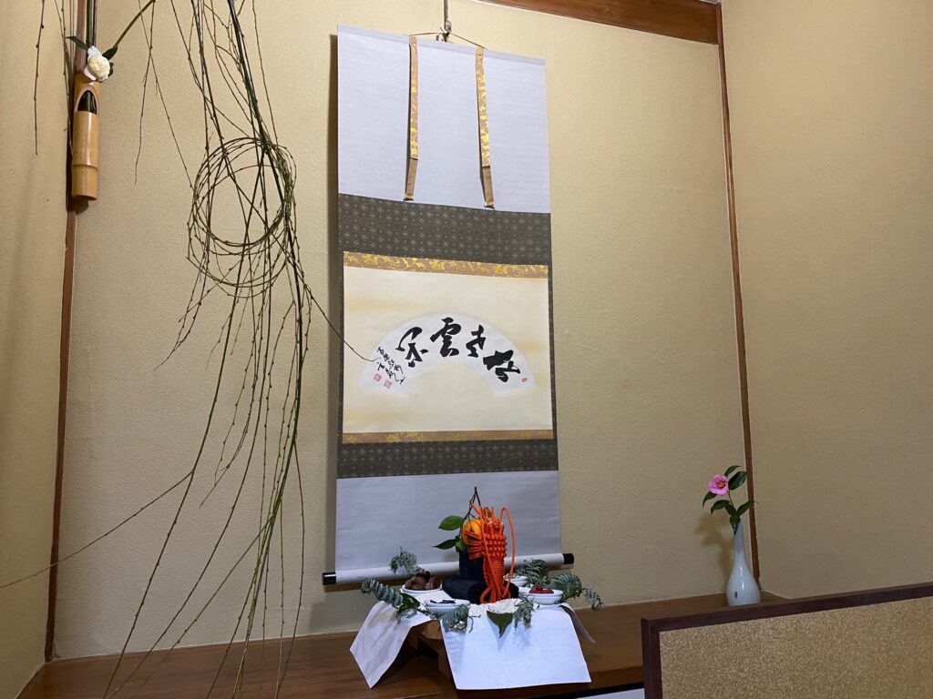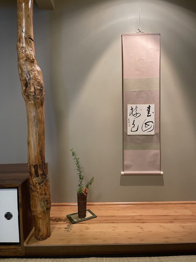 4月第3週からお稽古が始まりました。掛軸の色紙は、義母の手による遊び心一杯の書体で『春国樹色』、花は今年初めて我が家の庭で花を咲かせてくれた『木瓜』。水指は日本の先生の持たせてくださった、モダンな模様の清水焼。お茶碗は生徒さん持参の古そうな箱書きの『赤楽』。 From the third week of April, 2022, We started the tea ceremony practice again after my four months’ absence.I hung a scroll with the writing of four kanji letters […]