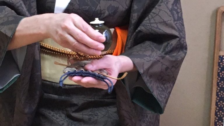 宗純先生の京都だより Sojun sensei ‘s journal from Kyoto 11月最期のおけいこは口切の茶事の中の口切の所作のお稽古でした。 立冬(11月7日前後)のころ、前の年の11月から使っていた茶葉が壺の中からなくなるので、炉を開いて今年の初夏に摘まれ、壺に詰められた新茶に手を付けることになります。新茶は初夏から11月頃まで約半年間壺の中で寝かされ、風味が最上になるのだそうです。そこで、壺の封を切って、新しい茶を出し石臼で挽いて抹茶にしたものを賞味する茶事を催すのです。これを口切の茶事と言います。 開封前の壺が床の間に飾られているので、初座の席入りをして床の間の壺を拝見します。亭主は客とあいさつを交わした後に、お茶入れ日記を正客へ拝見に出します。亭主は茶壷を踏み込み畳に運び客の方へ向いて封印されている茶壷の口を小刀で切り、蓋を開けて中の和紙に詰められた濃茶用の茶葉とその周りに詰められた薄茶の葉をそれぞれの小さい黒の茶壷にいれ、再び細長い和紙(封紙)で口を封じて自分の印を押す。封印された茶壷を網の中に入れ、茶壷の拝見に出します。 かつては、半年間熟成された茶葉を茶壷から取り出しそれを丁寧に挽いてお抹茶にして、亭主はもてなしました。今は亭主がわざわざ石臼で挽いてお抹茶を作ることは珍しくなっていると思いますが、その貴重な所作を経験することができました。ノリで封紙を壺の蓋に貼ったり、興味深いものでした。 The last lesson in November we practiced was the procedure from Kuchikiri tea ceremony. On around Ritto (considered as […]