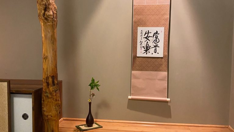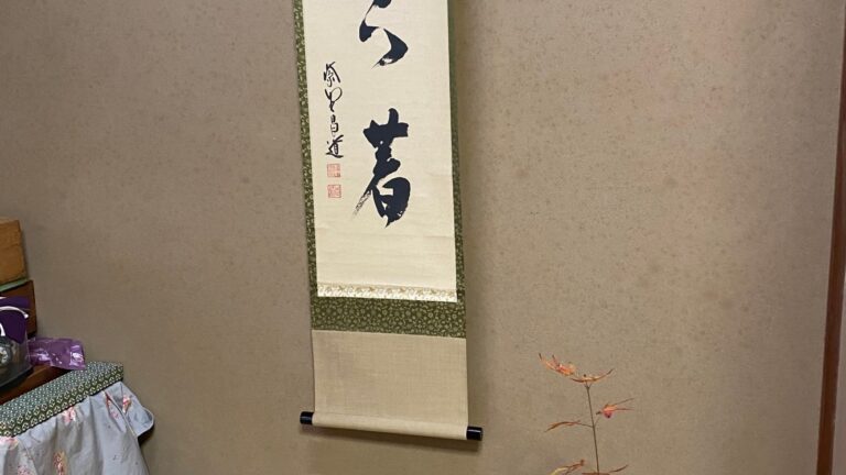 2023年11月1日 炉開きは亥の月新暦11月の最初の亥の日(今年は11月1日)に風炉から炉に変えて、その年に摘まれた新茶をいただく、お茶の世界でのお正月といわれているおめでたい行事です。 私のお教室では私が京都の先生にしていただいたように、毎年お善哉を炊いて、お稽古の前に皆さんに振舞っています。 床の間には今の季節にあった『紅葉舞秋風』のお軸をかけました。紫野大仙院桃林和尚の書です。お花は残菊。 お菓子は、生徒さんにも手伝ってもらって亥の子餅を作りました。 半年ぶりの炉のお稽古ですので、今日は薄茶炉点前の中でお道具の位置、炉での居前・客付など基本的な位置、所作を復習、確認しました。 Robiraki is a joyous event in the world of tea, often referred to as the New Year of tea. It takes place on the […]
