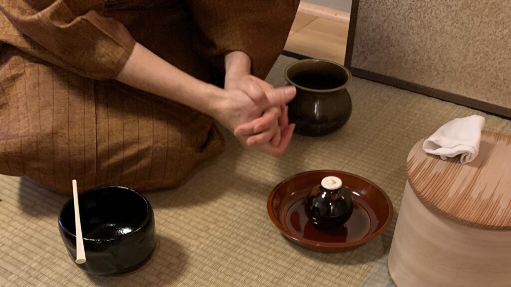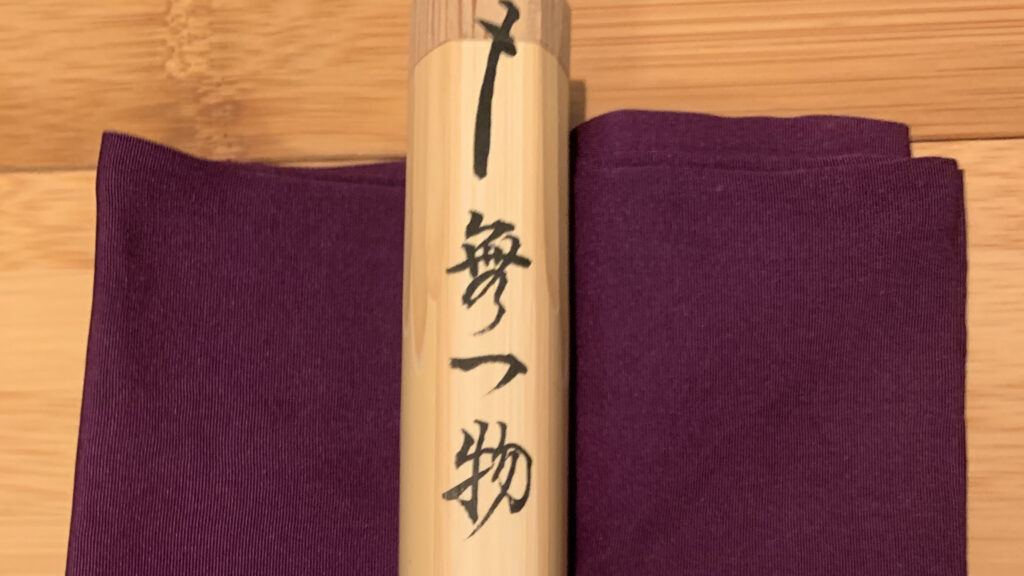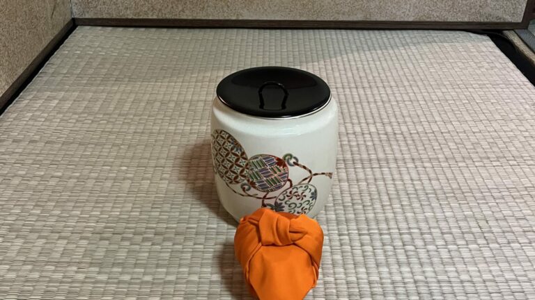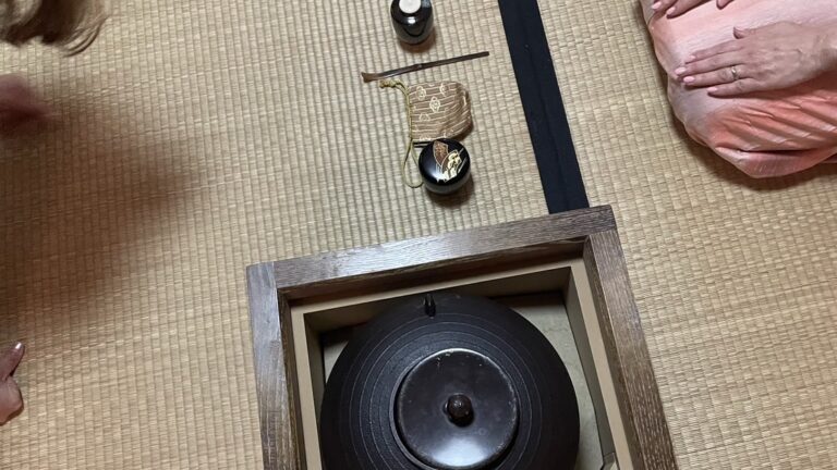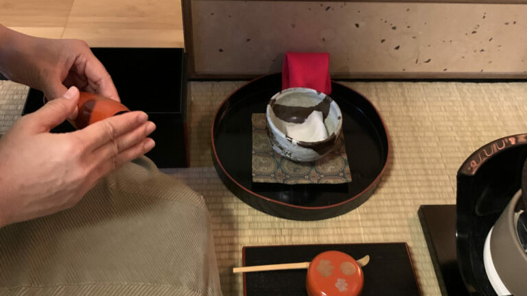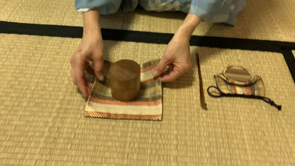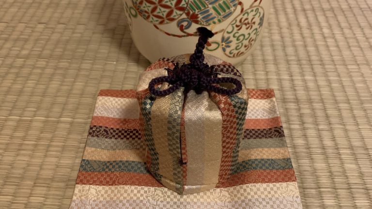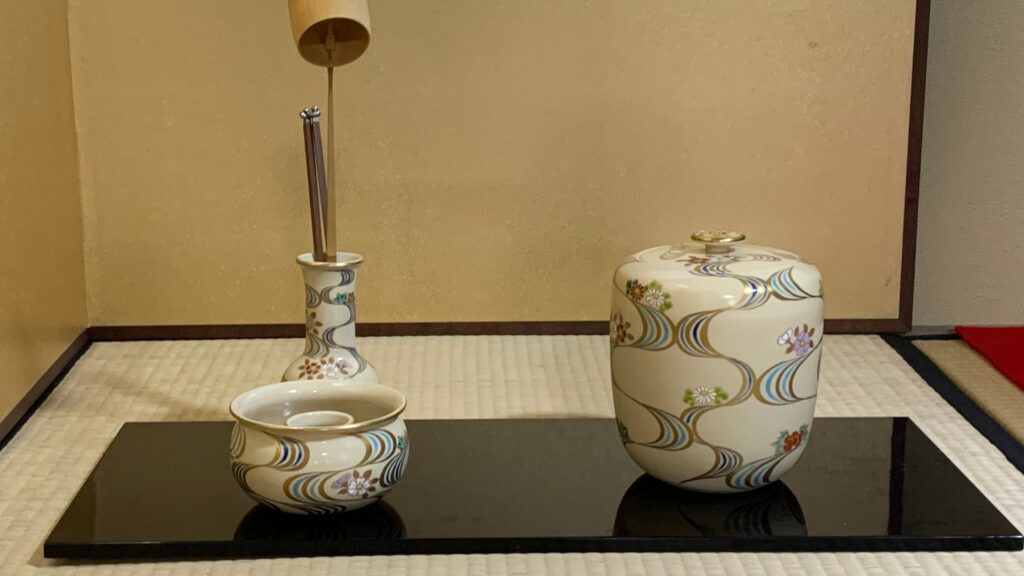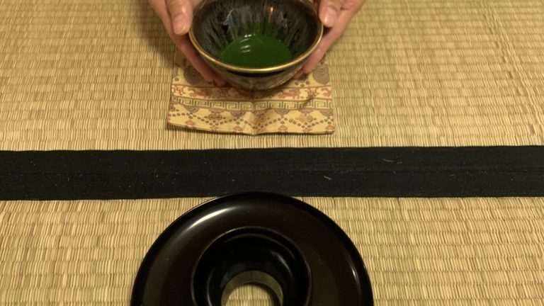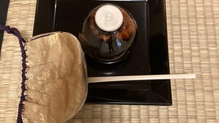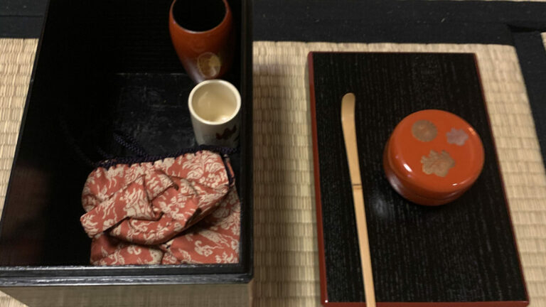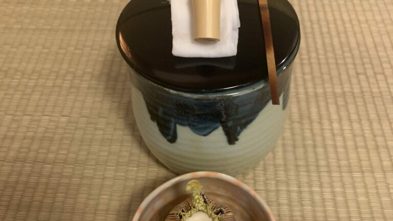 2023年10月 準備は染付・塗蓋水指の前に、お和巾の上に乗せた仕覆に入った中次茶入を置きます。黒楽茶碗の中に茶巾、茶筅、中節の茶杓を仕込みます。 お和布は先代好みの和布、名物古布の古帛紗です。 この点前では和布の扱い方を学びます。決まった手順で和布を取り上げるのですが、右手の小指をお和布の下に入れほかの指で中次を持つしぐさは、本当に美しいです。 In preparation, we readied the indigo-dyed water container with a lacquered lid and placed the Nakatsuji Chaire (tea container) in a Shifuku, a small silk […]
