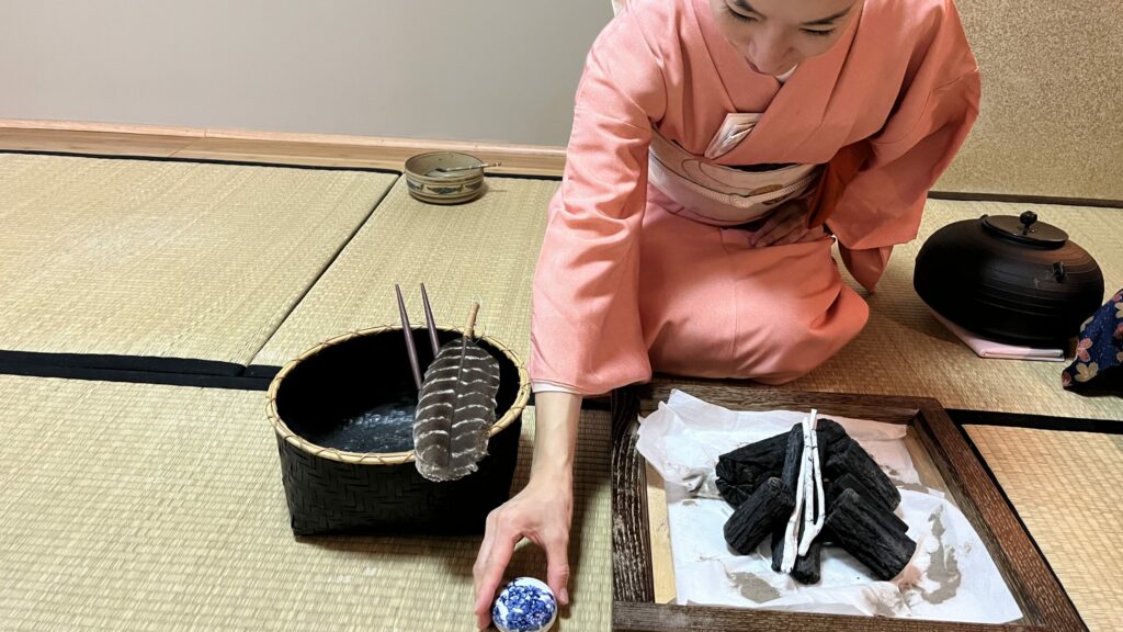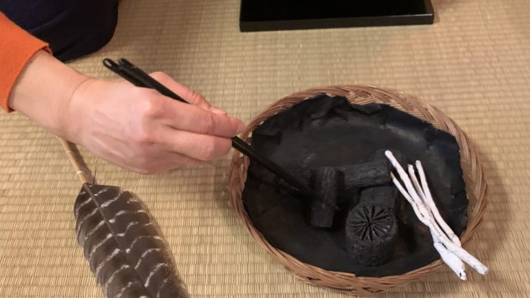 2023年11月第二週 11月最後のお稽古は初炭手前でした 炭手前の稽古は普段、なかなかできません。 私達の使用している炉は電熱の置き炉なので、炭手前に関しては色々工夫しながらお稽古してます。 羽箒(はぼうき)で初掃き、中掃き、後掃きの所作。灰器から灰匙で灰を掬って灰をまく。 炭にもそれぞれ名前がついているので名称を覚えながら。 後炭は炭の燃え具合で臨機応変に炭をいれますが、初炭ではそれぞれの炭を置く場所が定められています。 普段の生活では炭を身近に見られない昨今、好奇心をくすぐるお手前です。 The last practice in Nobember was the shozumi demae (first of two procedures to add charcoal to the fire.) This practice is […]