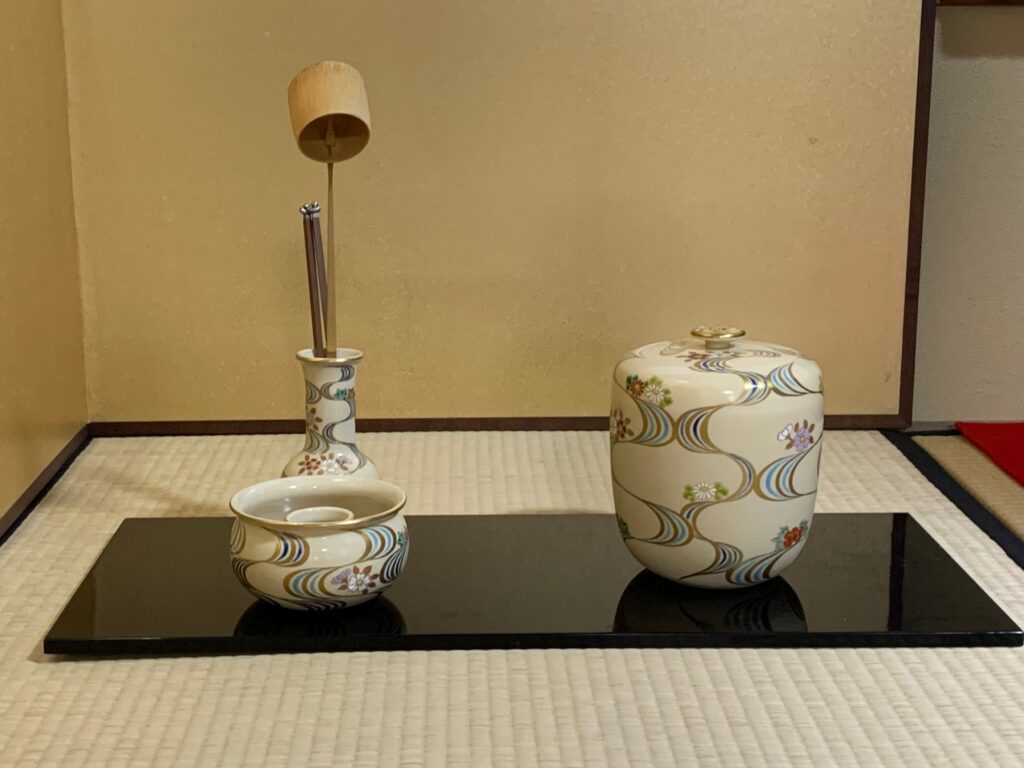 2023年10月 準備は染付・塗蓋水指の前に、お和巾の上に乗せた仕覆に入った中次茶入を置きます。黒楽茶碗の中に茶巾、茶筅、中節の茶杓を仕込みます。 お和布は先代好みの和布、名物古布の古帛紗です。 この点前では和布の扱い方を学びます。決まった手順で和布を取り上げるのですが、右手の小指をお和布の下に入れほかの指で中次を持つしぐさは、本当に美しいです。 In preparation, we readied the indigo-dyed water container with a lacquered lid and placed the Nakatsuji Chaire (tea container) in a Shifuku, a small silk […]