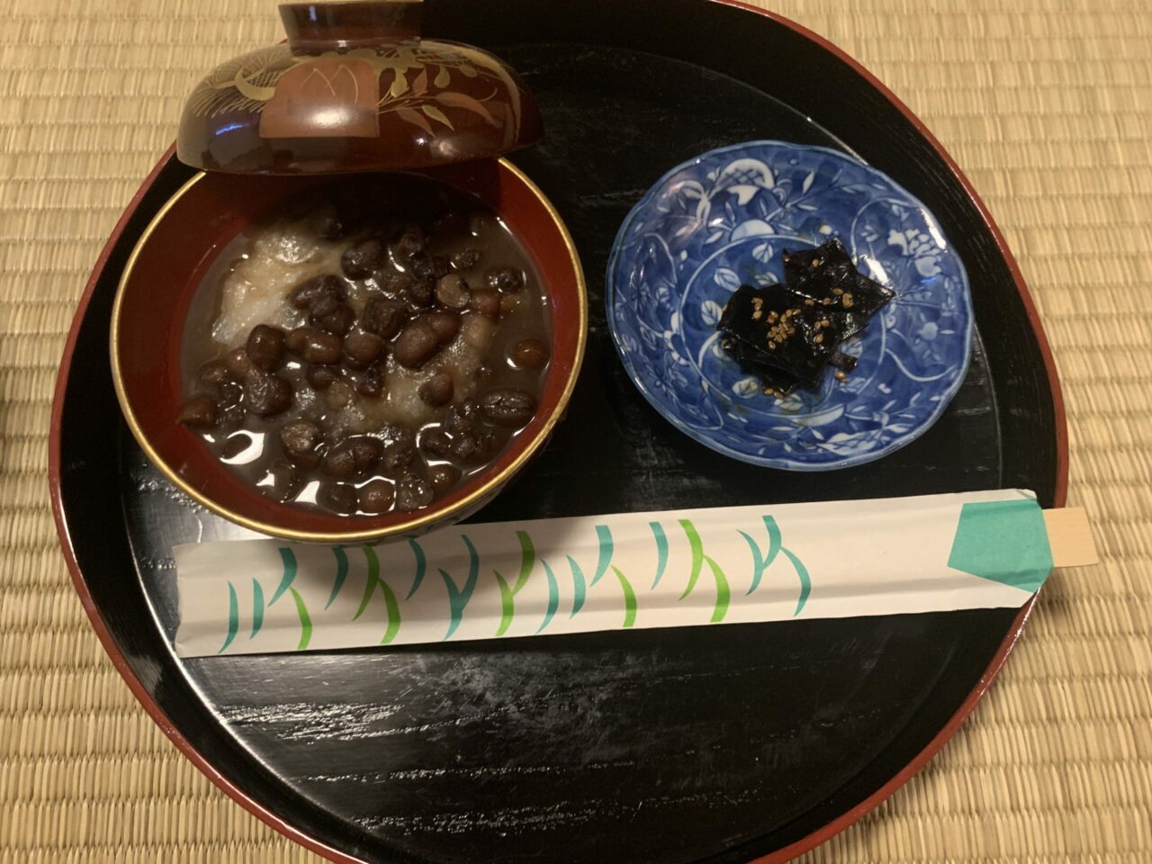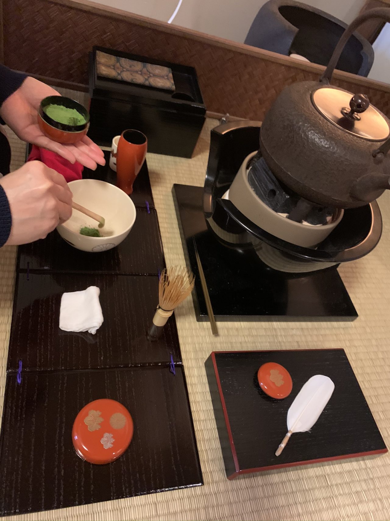 今週は盆点のお稽古です。丸盆を使用しましたが、その他に四方盆、五角盆、菱形盆があり、それぞれ茶を点てる前の浄め方、拝見に出す前の浄め方が少しずつ異なります。この点前も唐物と同様、文琳茶入れかナス型茶入れを使用しますので、唐物で学んだ仕覆の扱い、茶入れの浄め方が応用できますし、象牙の茶杓を使用しますので台天目で象牙の茶杓の浄め方、扱い方を稽古していますのでこれも応用できます。仕覆を脱がせた唐物茶入れを盆から取りだす時、盆の上に戻す時、は必ず『もみ手』をして手を浄めることも留意点ですね。 We practiced bondate in the third week of December, using a round tray, one of the four different shapes of trays. Each tray has its own way of cleaning before both making […]